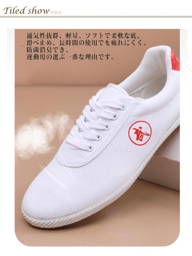 | クッション性と耐久性を両立したラバーソールを採用された! 長時間歩いていても疲れにくいデザインとなってます!! 通気性抜群、軽量、ソフトで柔軟な底、滑べ止め、長時間の使用でも疲れにくく、防菌消臭でき、運動用の選ぶ一番な理由です。 クラシックなスニーカータイプのデザインなので、太極の行き帰りもこれ1足でOK! | |