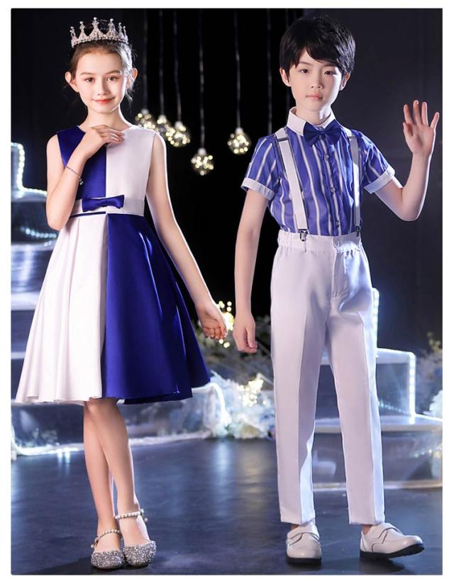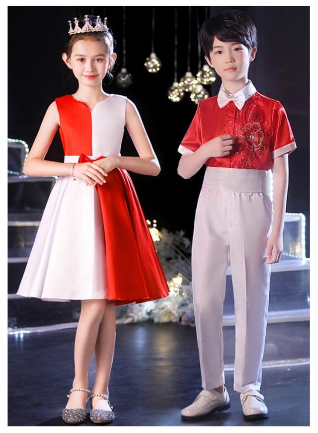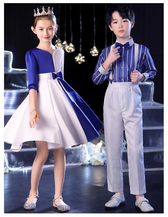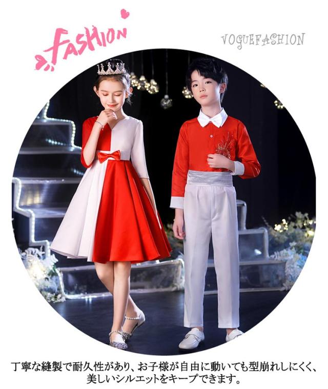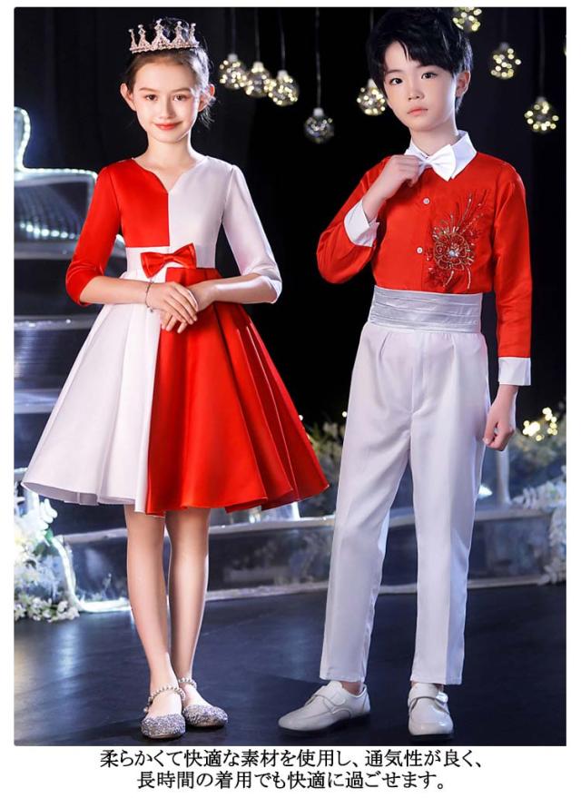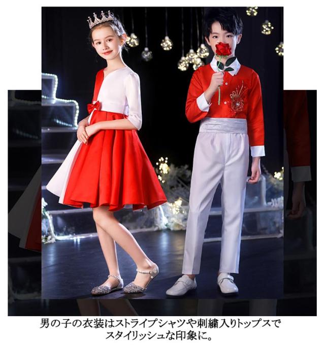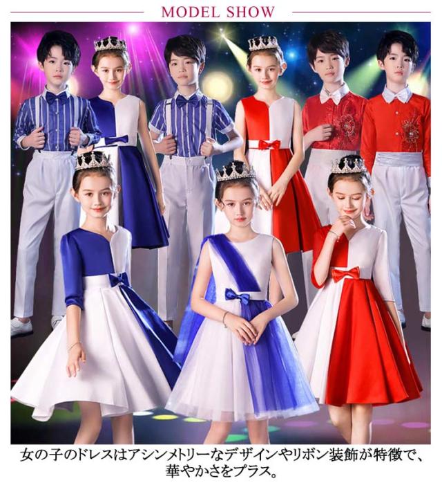 | レッド、ブルー、ホワイトの組み合わせが、洗練された上品な印象を演出。ステージ上で目を引くデザインです。 女の子のドレスはアシンメトリーなデザインやリボン装飾が特徴で、華やかさをプラス。 男の子の衣装はストライプシャツや刺繍入りトップスでスタイリッシュな印象に。 柔らかくて快適な素材を使用し、通気性が良く、長時間の着用でも快適に過ごせます。 丁寧な縫製で耐久性があり、お子様が自由に動いても型崩れしにくく、美しいシルエットをキープできます。 子供の日のイベント、合唱コンクール、ダンスパフォーマンス、才能発表会など、さまざまなシーンで使用可能。 | |