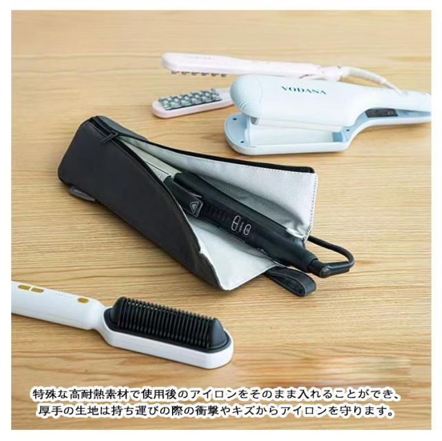 | ヘアアイロンが冷めるまで待たなくてもいい耐熱ヘアアイロンポーチ。耐熱300℃ 旅行などにアイロンを持っていきたい時におすすめ。 ファスナーで開閉できるポーチタイプなので、旅行になど持ち運びにも便利です。大きめのヘアアイロンでも安心です。 特殊な高耐熱素材で使用後のアイロンをそのまま入れることができ、厚手の生地は持ち運びの際の衝撃やキズからアイロンを守ります。 撥水加工で洗面所に吊り下げでも◎!また、洗面所に吊るしておけばアイロンをスムーズに出し入れもできます。 背面にはコードや小物をまとめて収納できる便利な収納ポケット付きなのもうれしいポイントです。 | |