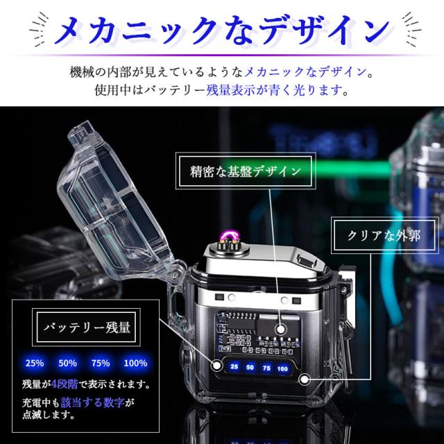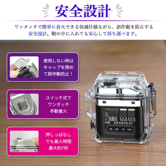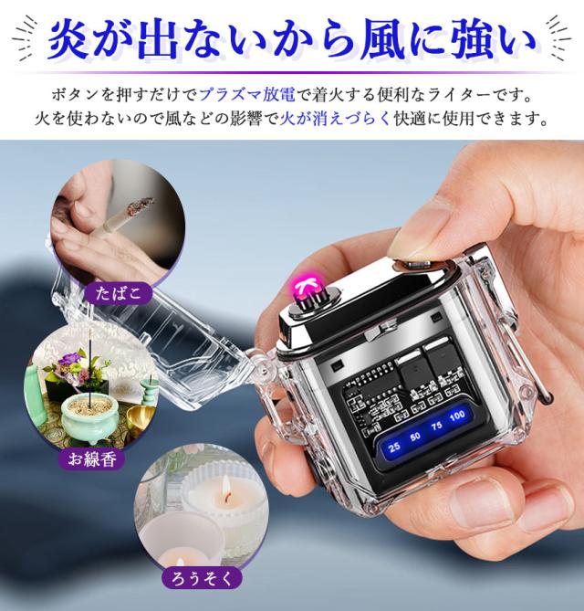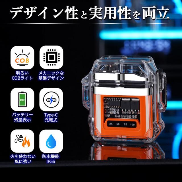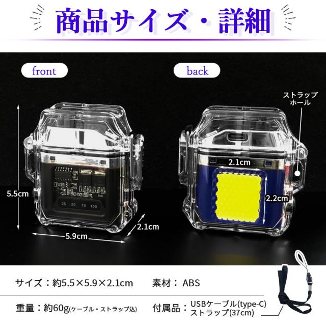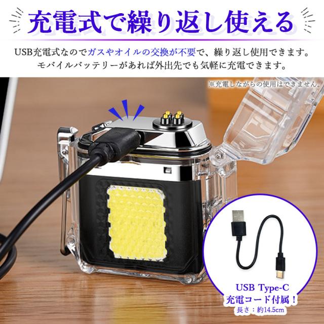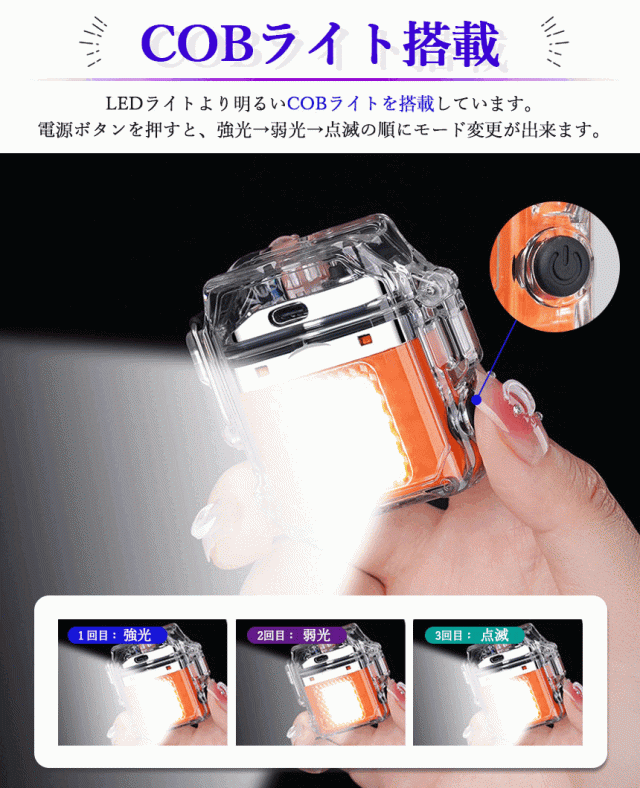 ●防水機能&COBライト付き 電子ライター●ボタンを押すだけでプラズマ放電で着火!火を使わないので風などの影響で消えにくく簡単に着火できるライターです。一般的なライターと違い充電式なのでガスやオイルの交換も不要で繰り返し使用可能なところも魅力的です。