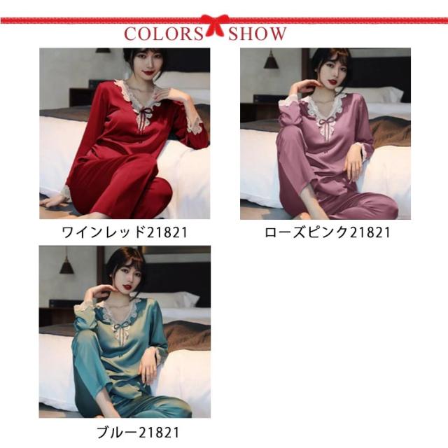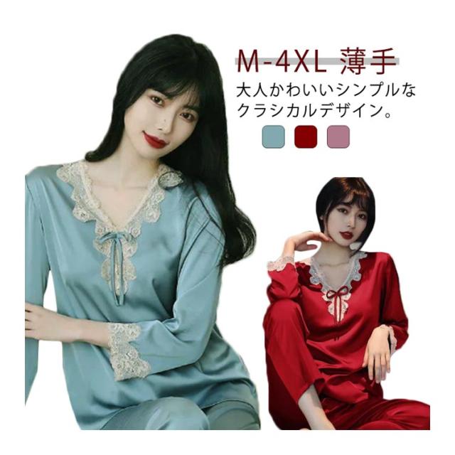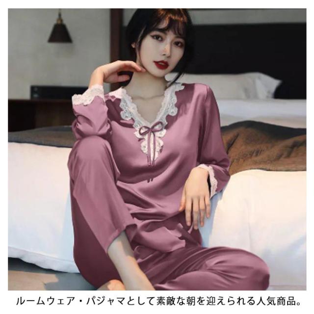 レディース 母の日 春夏 サテン 薄手 光沢 上下セット パジャマ 長袖 レース パジャマ 合成シルク 無地 ナイトウェア 寝間着 シルクタッチ 部屋着 シンプル パジャマ プレゼント 韓国風
