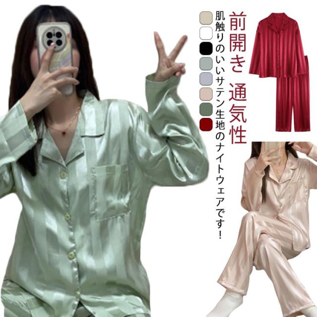 ルームウェア パジャマ ルームウェア サテン 春 長袖 レディース シルク調 上下セット 前開き 夏 ゆったり 部屋着 通気性 入院着 吸汗通気 肌に優しい パジャマ ナイトウェア トップス ボトムス
