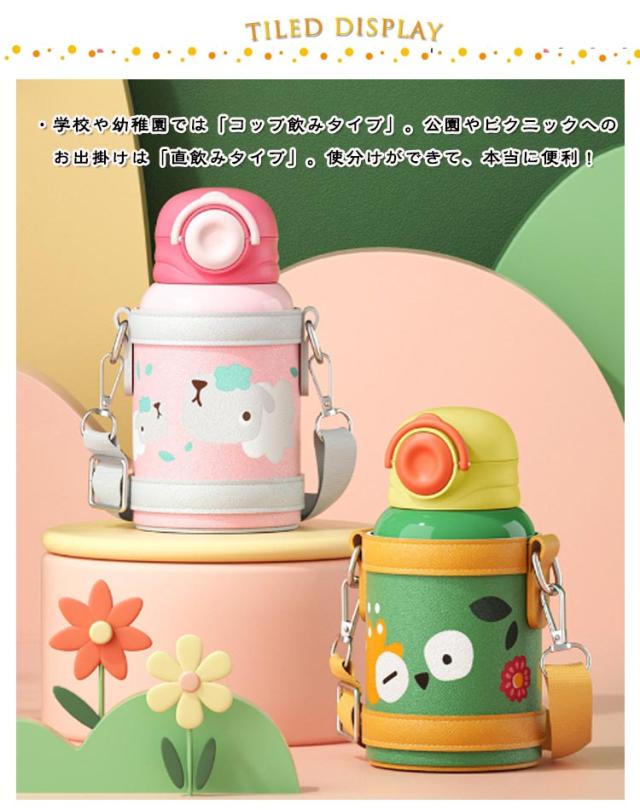 | ・キャップを替えて使い方2通り! ・直飲みとコップ飲み、どちらにも対応した2WAYステンレスボトル ・広い口径で氷が入れやすく、お手入れもラクラク。 ・肩からかけられるストラップ付きで、お子様の身長に合わせて調整可能。 ・学校や幼稚園では「コップ飲みタイプ」。公園やピクニックへのお出掛けは「直飲みタイプ」。使分けができて、本当に便利! | |