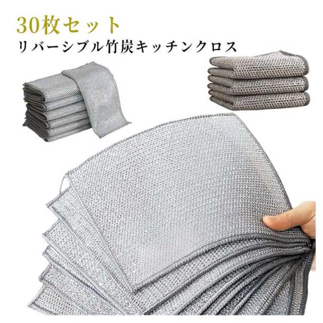 両面 竹炭 キッチンタオル 台所 布巾 キッチンクロス ワイヤーふきん 食器洗いタオル 食器拭き リバーシブル 30枚セット 油汚れ対策 銀糸入り 油汚れクロス 吸水 速乾 洗浄力 家庭用 業務用 風呂掃除