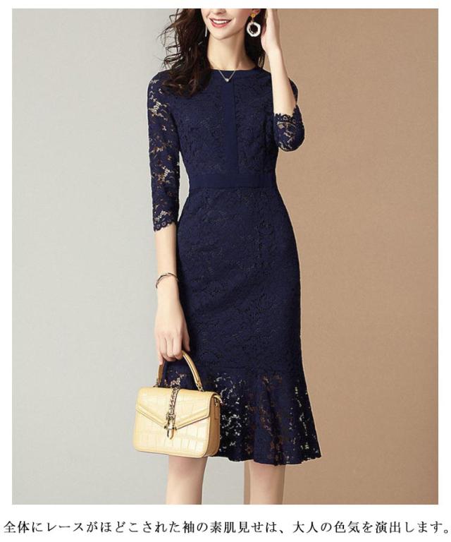 パーティードレス 5分袖 総レース マーメイドライン パーティドレス タイトワンピース レースマーメイドワンピース ミモレ丈 膝丈 レディース 大人 レースマーメイドワンピース フォーマル 演奏会 謝恩会 成人式 同窓会 ドレス レース