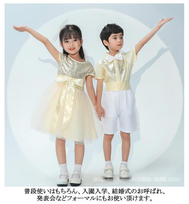 | 爽やかで夢幻的なライトブルーと、上品で温かみのあるシャンパンゴールドの2色から選べ、ステージ上で華やかに映えます。 スパンコール装飾が光を反射し、ステージ上でキラキラと輝く仕上がり。 女の子のドレスには大きなリボンがアクセントになり、光沢のある生地にチュールレースを何枚も重ねて透明感のあるデザインに仕上がりました♪ 男の子のシャツも光沢感のあるディテールでスタイリッシュに。ビジューが飾られているのでアクセサリーなしでもバッチリ!! 普段使いはもちろん、入園入学、結婚式のお呼ばれ、発表会などフォーマルにもお使い頂けます。 | |