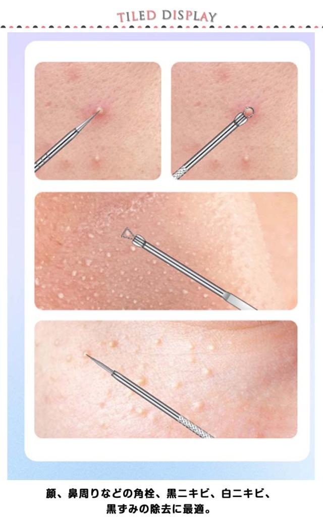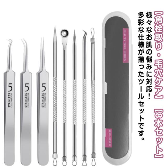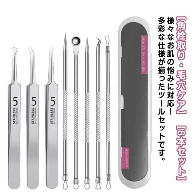 | 【角栓取り・毛穴ケア】【8本セット】 様々なお肌の悩みに対応!多彩な仕様が揃ったツールセットです。 顔、鼻周りなどの角栓、黒ニキビ、白ニキビ、黒ずみの除去に最適。 ピンポイントで吹き出物にタッチ出来るため、痛みや肌への負担を最小限に抑えられます。 毛抜きとしても使用可能です。 材質は錆びにくい抗菌ステンレス製で衛生面も安心。 収納ケース付で使い勝手抜群の一品です。 自宅で手軽にスキンケアできます | |