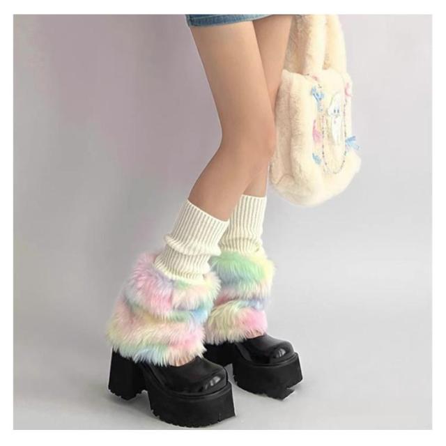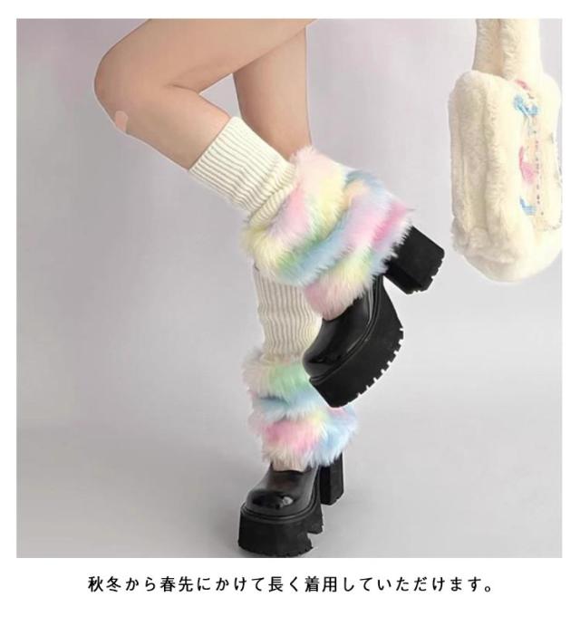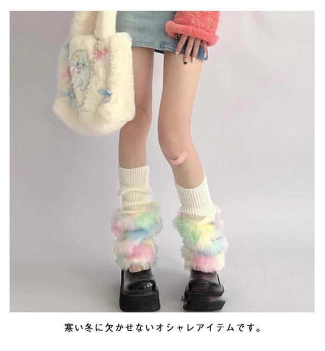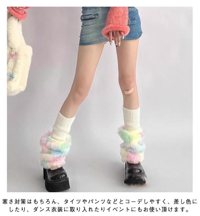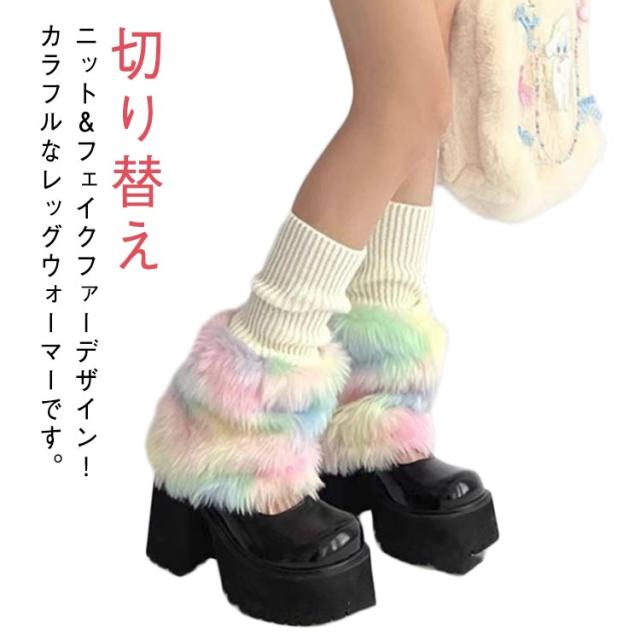 保温 フェイクファー 暖かい 衣装 ルーズソックス 韓国ファッション ふわふわ かわいい あたたかい レッグカバー ボリューム感 切り替え ダンス ニット ヒップホップ コスチューム 切り替え 個性的 Y2K レインボー