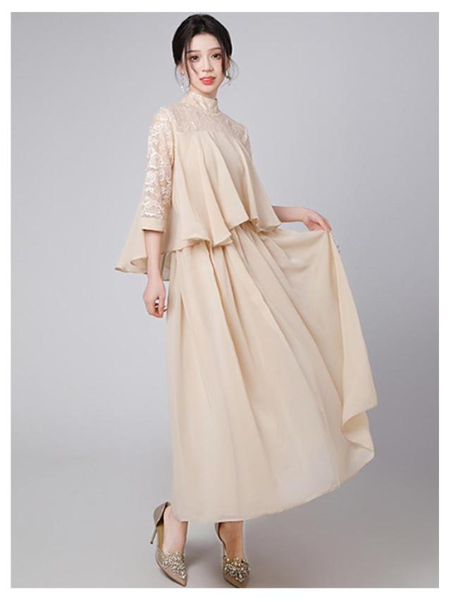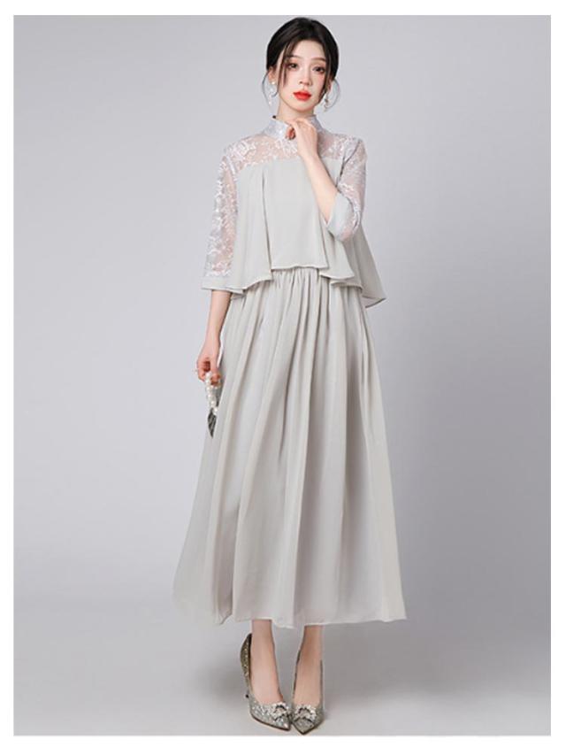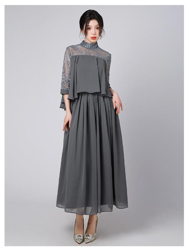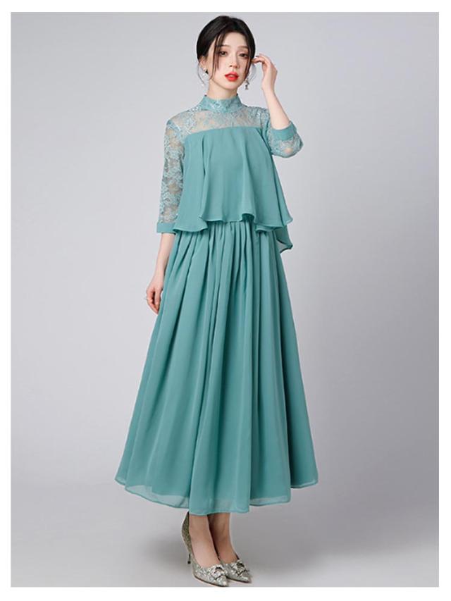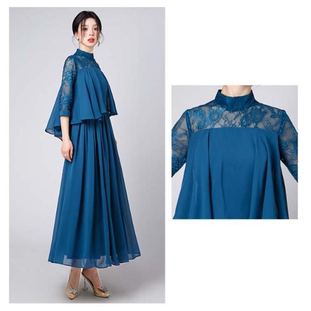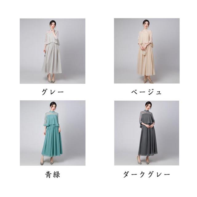 スリーブ 立ち襟 シフォン ワンピース ロング丈 体型カバー 七分袖 シースルー パーティードレス 結婚式 フレアワンピース Aラインワンピース ウエスト切り替え おしゃれ 上品 きれいめ 大人 レース 高級感 小柄 フェミニン 謝恩会 卒業式 お呼ばれ