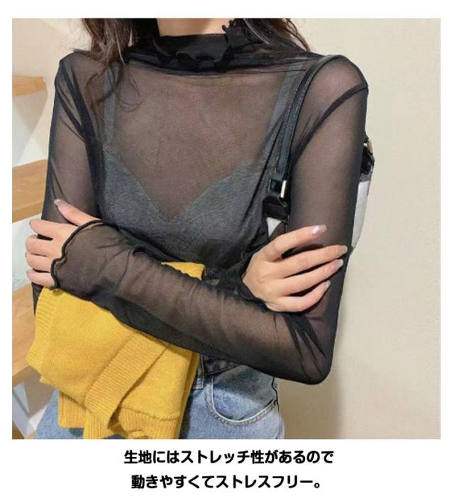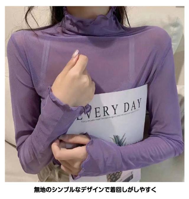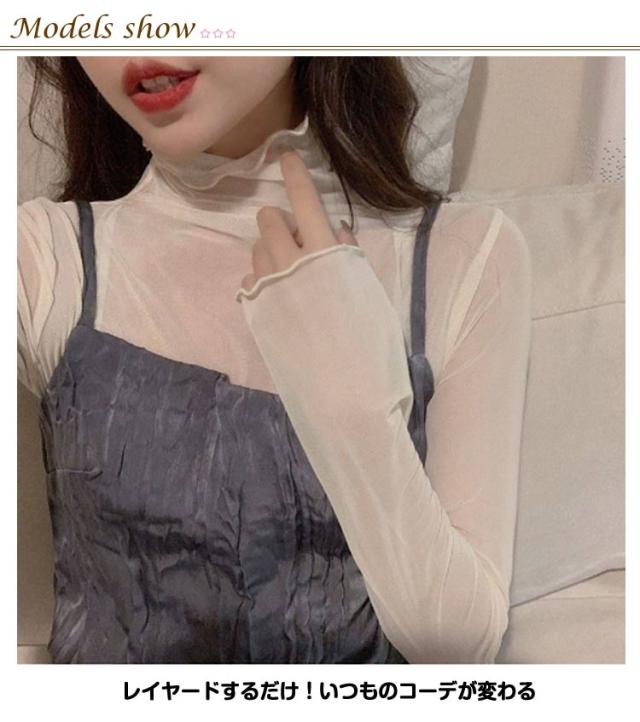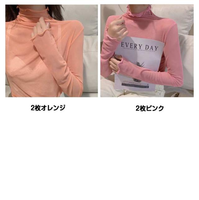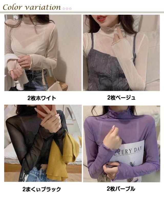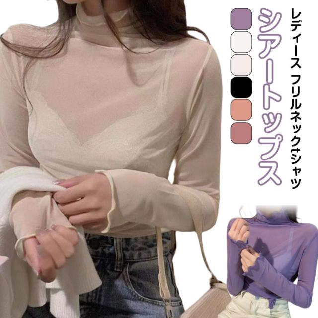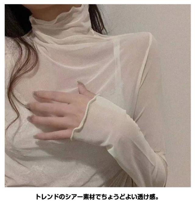 2枚セット 2枚セット カットソー インナー シアートップス 長袖 レディース 重ね着 シースルー 春夏 透け タートルネック おしゃれ 秋 レイヤード コーデ 無地 柔らかい 普段着 オフィス メロウフリル フリルネック シアーシャツ