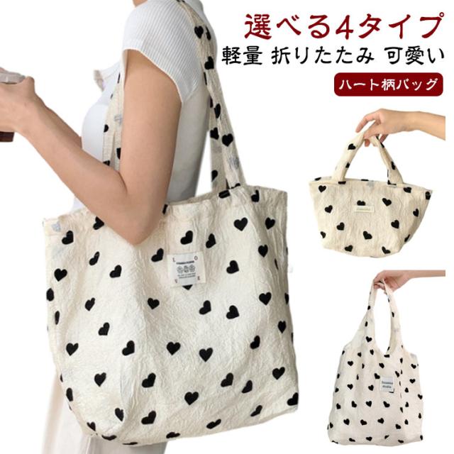 ハート柄 選べる4タイプ 大容量 折りたたみ 軽量 お洒落 エコバッグ バッグ サブバッグ ハート柄バッグ お買い物 可愛い トートバッグ 韓国風 鞄 トート ショルダーバッグ 肩掛け 手提げ 大容量 お出かけ