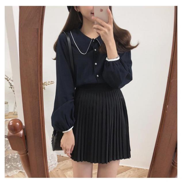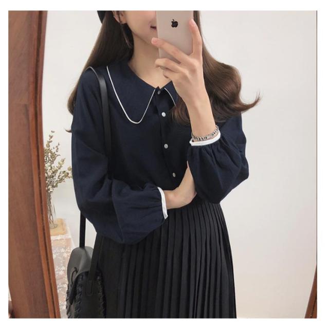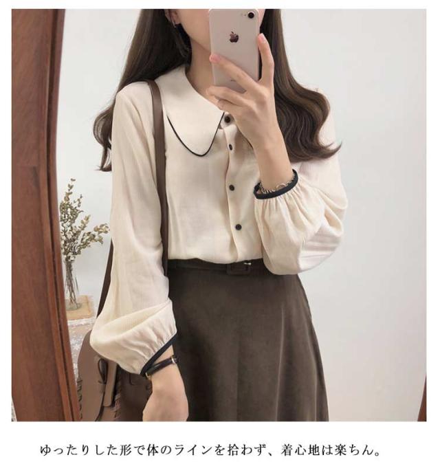 | 配色のパイピング長袖ブラウス ボリュームのある袖が、女らしさを高めます。 ゆったりした形で体のラインを拾わず、着心地は楽ちん。 幅広いコーデに! | |