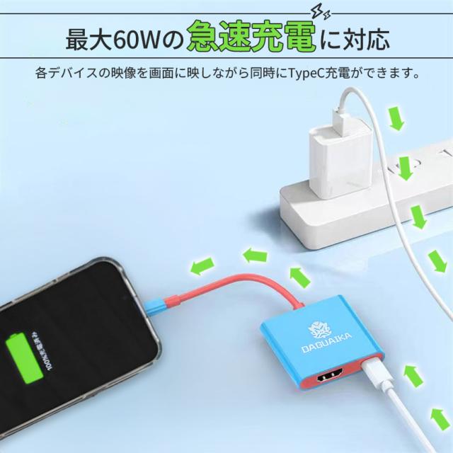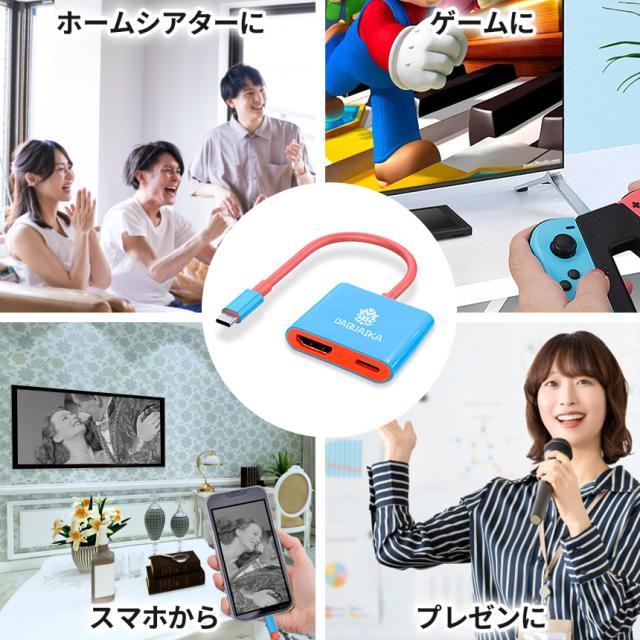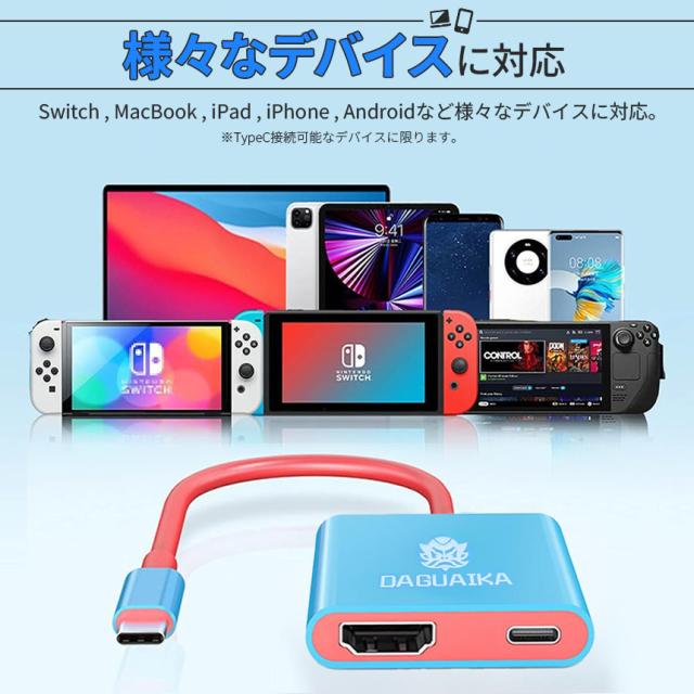 >>>一台二役<<<充電をしながら映像変換が可能な変換アダプターです。TypeCデバイスからHDMIへ映像や画像などを出力します。スマホやゲーム機、PCなどのデバイスの映像をモニターに映し出すことができます。