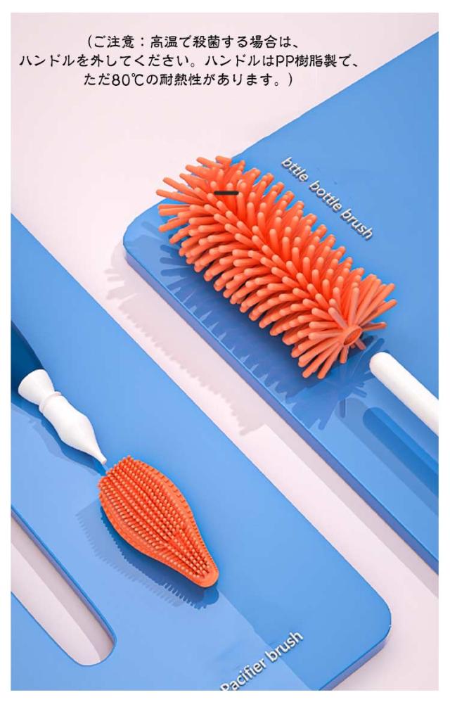 | 哺乳瓶やその部品を洗う専用のブラシ3点セットです。 シリコンブラシは汚れを効果的に落とし、乾きも早く、細菌が繁殖しにくいので衛生的です。 環境に優しいシリコン製で、耐久性に優れた高温も耐えるので安心です。 360度回転可能なブラシハンドルで、ボトルの隅々まで汚れをこすり落とします。 おしゃぶりブラシは乳首型なので、内部を深く洗浄できる。 ストローブラシは、ストローの内側を洗うのに便利です。 (ご注意:高温で殺菌する場合は、ハンドルを外してください。ハンドルはPP樹脂製で、ただ80℃の耐熱性があります。) | |