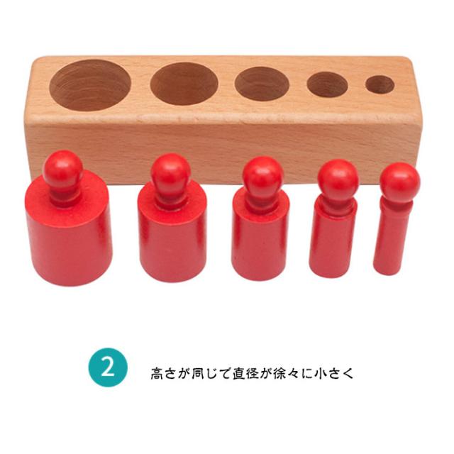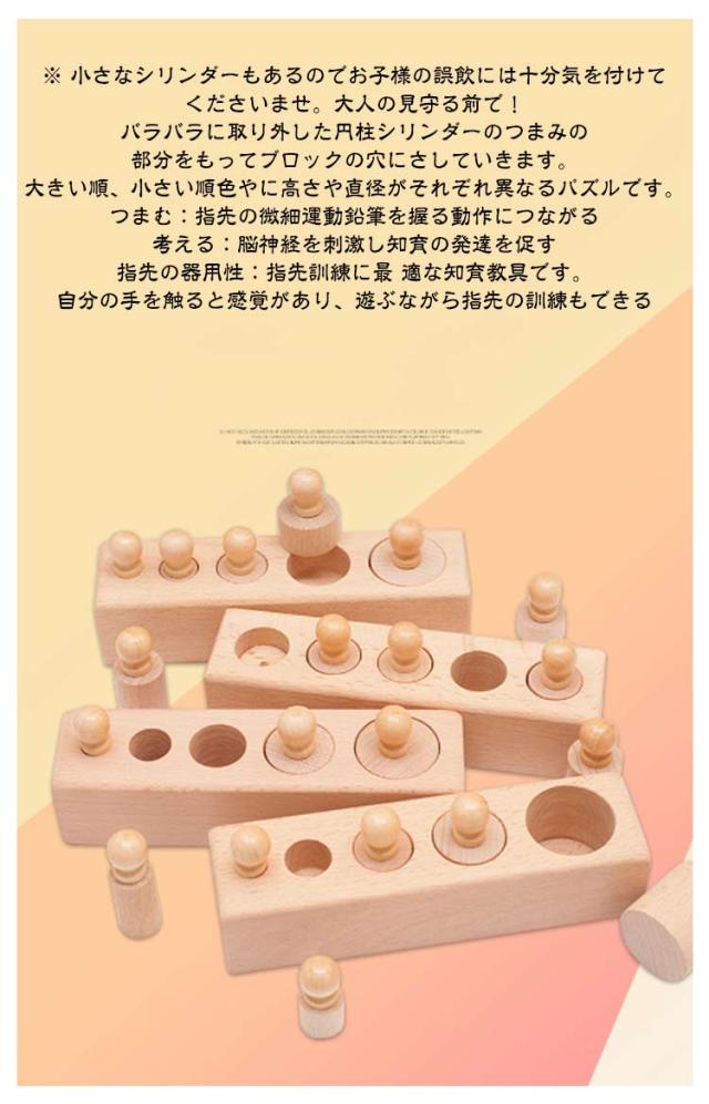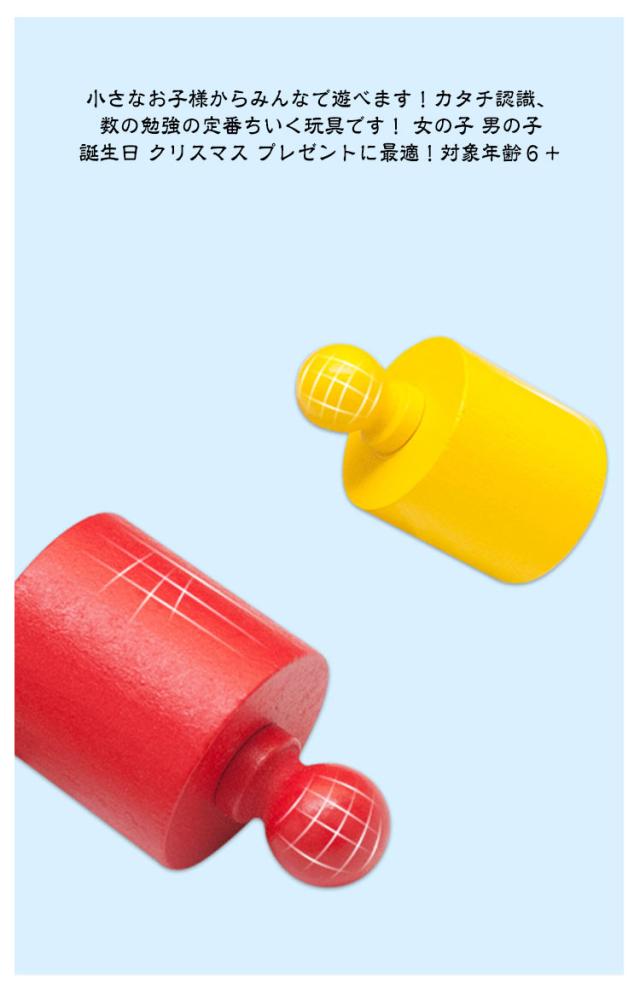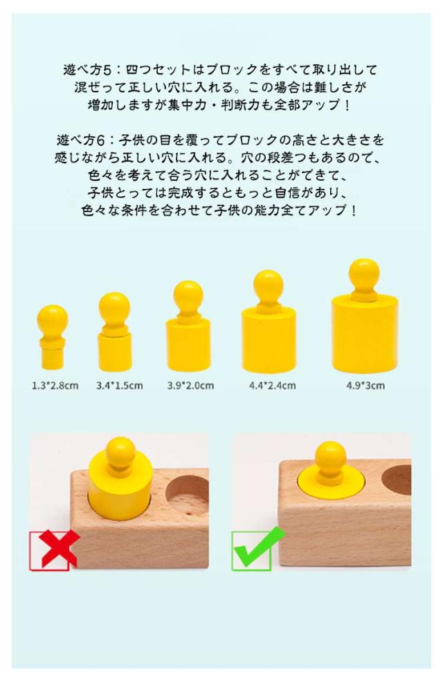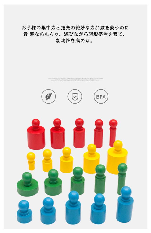 | 知育玩具 木製パズル モンテッソーリ教具 4本セット カラフルな円柱さし登場しました! モンテッソーリ教具 子供の集中力・指先の器用性・図形感覚を育て、創造性を高める シリンダー ブロック4つセットし、型はめはもちろん、積んだり転がしたり、遊びの中で、自然に形を認識できるようになる。 お子様の集中力と指先の絶妙な力加減を養うのに最 適なおもちゃ、遊びながら図形感覚を育て、創造性を高める。 ※ 小さなシリンダーもあるのでお子様の誤飲には十分気を付けてくださいませ。大人の見守る前で! バラバラに取り外した円柱シリンダーのつまみの部分をもってブロックの穴にさしていきます。 大きい順、小さい順色やに高さや直径がそれぞれ異なるパズルです。 つまむ:指先の微細運動鉛筆を握る動作につながる 考える:脳神経を刺激し知育の発達を促す 指先の器用性:指先訓練に最 適な知育教具です。自分の手を触ると感覚があり、遊ぶながら指先の訓練もできる 小さなお子様からみんなで遊べます!カタチ認識、数の勉強の定番ちいく玩具です! 女の子 男の子 誕生日 クリスマス プレゼントに最適!対象年齢6+ 【多種多様な遊び方】 遊べ方1:四つ円柱の中に一つを選んでブロックは全部出して正しい穴の近くに置く。 子供はそのブロックを正しい穴に入れて、ブロックの大きさと高さを感じることができる。 遊べ方2:四つ円柱の中に一つを選んでブロックをすべて出して混ぜる。子供は正しい穴に入れて判断力がアップ! 遊べ方3:四つ円柱の中に二つを選んでブロックをすべて出して混ぜって正しい穴に入れる。この場合はA+B・A+C・A+D・B+C・B+D・C+Dと6種類の異なる組み合わせがある。 遊べ方4:四つ円柱の中に三つを選んでブロックをすべて出して混ぜって正しい穴に入れる。この場合はA+B+C・A+B+D・A+C+D・B+C+Dと4種類の異なる組み合わせがある。 遊べ方5:四つセットはブロックをすべて取り出して混ぜって正しい穴に入れる。この場合は難しさが増加しますが集中力・判断力も全部アップ! 遊べ方6:子供の目を覆ってブロックの高さと大きさを感じながら正しい穴に入れる。穴の段差つもあるので、色々を考えて合う穴に入れることができて、子供とっては完成するともっと自信があり、色々な条件を合わせて子供の能力全てアップ! | |