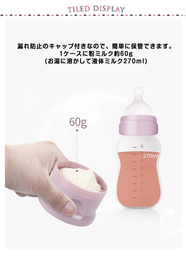 | 【2個セット】 【粉ミルクの持ち運びに!】 夜間の授乳に、お出かけに、様々な場面で大活躍のミルクケースが登場! ミルクケース1本で授乳3/4回分の粉ミルクを持ち運べるので、お出かけにも便利です。 水洗い可能、分解して綺麗に洗える。 エコのPP素材を使用し、耐久性はもちろん、環境にも優しい素材です。 授乳期が終わっても、おやつ入れやちょっとした小物入れにも使えるような長く使えるデザインを目指しました。 哺乳瓶に入れやすいロート付きなので、粉ミルクを入れやすく! 分層設計なので、赤ちゃんが外食したり、自宅で使用したりするのに簡単です。 漏れ防止のキャップ付きなので、簡単に保管できます。 1ケースに粉ミルク約60g (お湯に溶かして液体ミルク270ml) | |