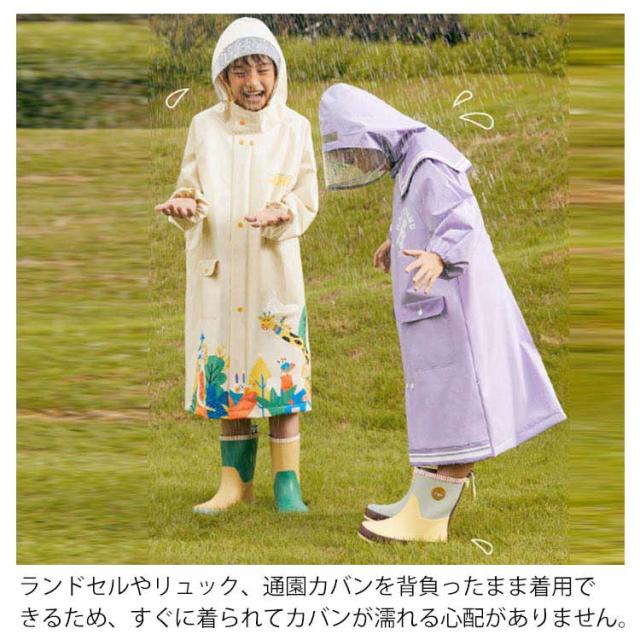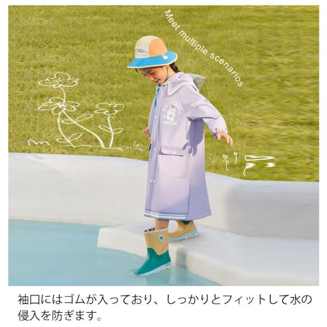 | スナップボタンとファスナーの仕様で水の侵入をしっかり防ぎます。 TPUで防水コーティング処理されていて、防水性が良くて台風や梅雨時期には役たちます。 撥水効果により汚れにくく、お手入れも簡単です。 ランドセルやリュック、通園カバンを背負ったまま着用できるため、すぐに着られてカバンが濡れる心配がありません。 透明なフードで視界が確保され、深くかぶっても視野が狭くなりません。 袖口にはゴムが入っており、しっかりとフィットして水の侵入を防ぎます。 | |