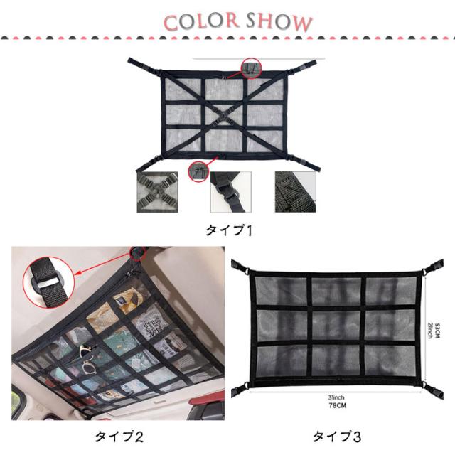 | 【車用天井収納ネット】【全7種類】 車の天井に取り付けるだけで、荷物をしっかりと収納できる便利なネットです。小物やバッグ、衣類など、普段使いのアイテムを天井に収納することで、車内を広く使うことができます。シートの下やトランクの整理では収まりきらない荷物を、簡単に収納できるため、旅行やアウトドアにも最適です。 取り付けは非常に簡単で、車内の天井に付属のベルトを使って固定するだけ。特別な工具や技術は不要で、誰でも手軽に設置できます。しっかりとした素材とデザインで、急ブレーキやカーブでも荷物が落ちることなく、安全に収納できます。使用しないときは、簡単に取り外して収納可能。使い勝手の良さが魅力です。 強度と耐久性に優れた設計で、長期間の使用にも耐えられます。荷物の重さや引っ張りにも強く、車内での使用にも安心。荷物を載せても垂れにくく、ルームミラーや後方の視界を遮ることなく、安全に荷物を収納することが可能です。 推奨車種:アシストグリップ等の固定箇所が4つ以上ある、車高の高い軽自動車・ミニバン・SUVなど | |