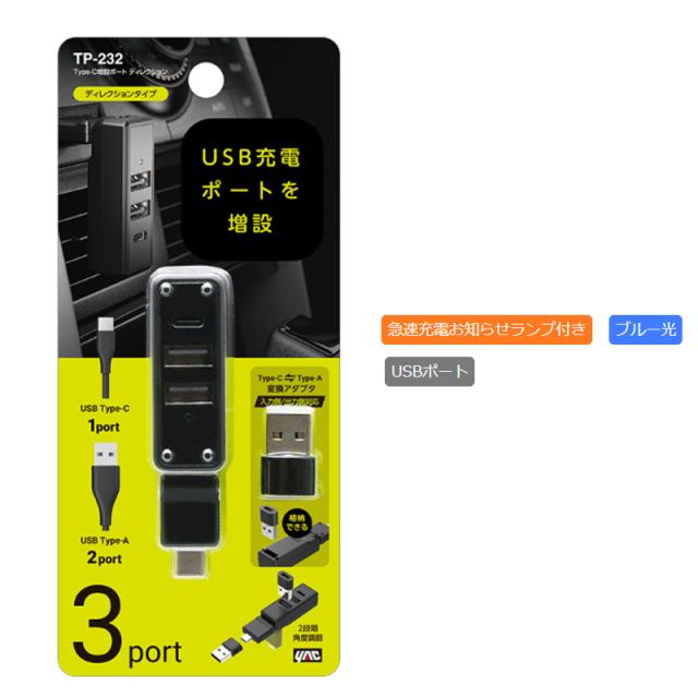 Type-C増設ポート ディレクション 車 Type-A Type-C変換アダプタ ヤック TP-232