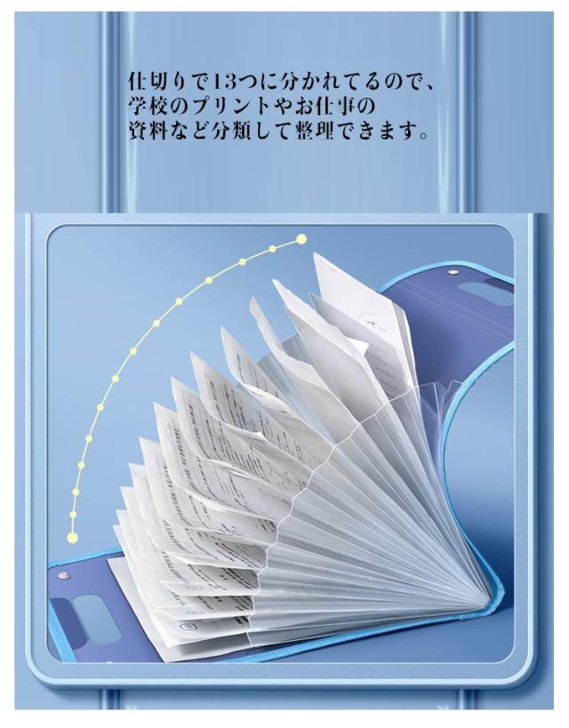 | 3個セット! 13ポケット ファイルの整理整頓に欠かせない収納ケース アコーディオン式、蓋が大きく開くので、書類の出し入れがスムーズにできます。 書類の区分けに便利なインデックス付き。書類を分かりやすく分類できます。 仕切りで13つに分かれてるので、学校のプリントやお仕事の資料など分類して整理できます。 取っ手付き、お仕事や勉強の資料ファイルの持ち運びがラクラク。 スナップボタンを留めると中のものも落ちにくいので安心です! | |