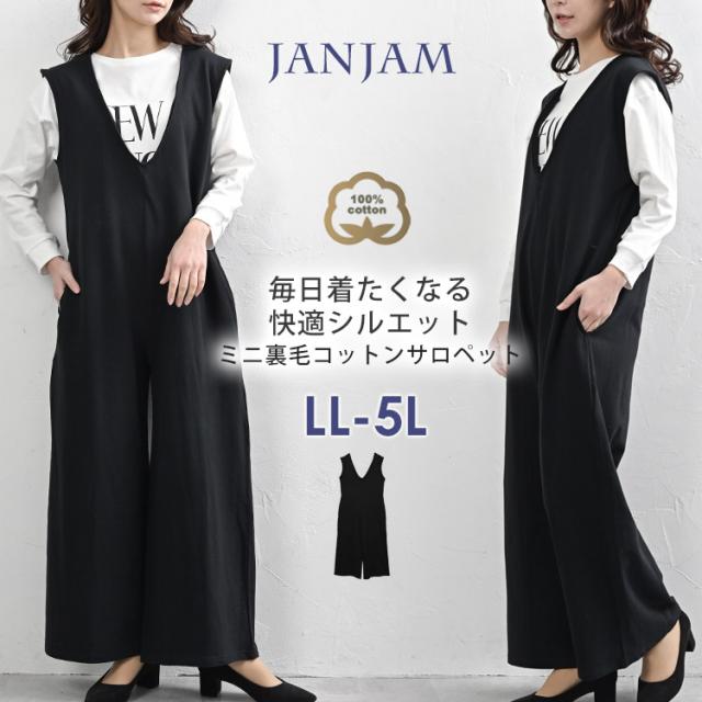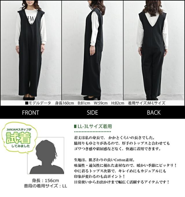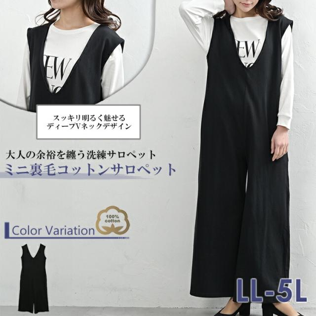 送料無料※沖縄/北海道対象外 大きいサイズ レディース ジャンプスーツ Vネック ミニ裏毛 ワイドサロペットパンツ cotton100 ワンピース LL-3L/4L-5L ゆったりサイズ ぽっちゃり女子 プラスサイズ