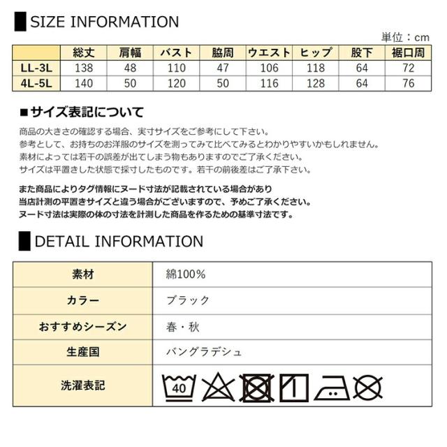 LL-3L:総丈138 肩幅48 バスト110 脇周47 ウエスト106 ヒップ118 股下64 裾口周72