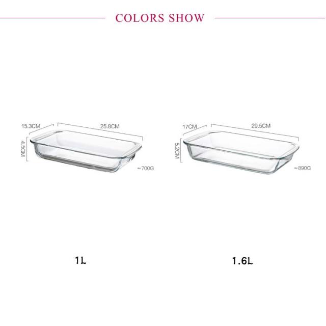 | サイズについての説明 | サイズ:【容量1L】25.8*15.3*4.5cm 耐熱温度:-20〜400℃ 【容量1.6L】29.5*17*5.2cm 耐熱温度:-20〜400℃ ※サイズ計測には誤差が生じます。 |