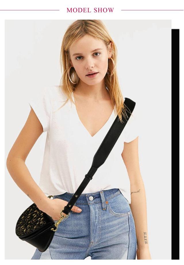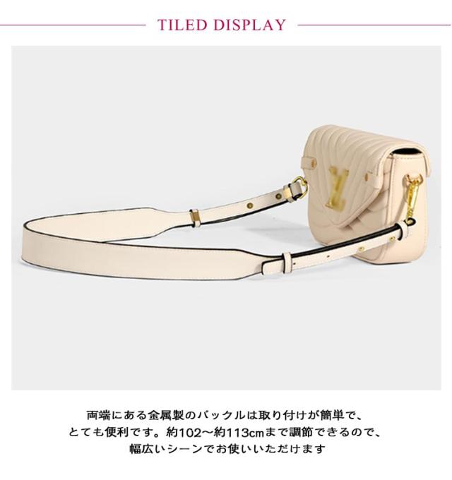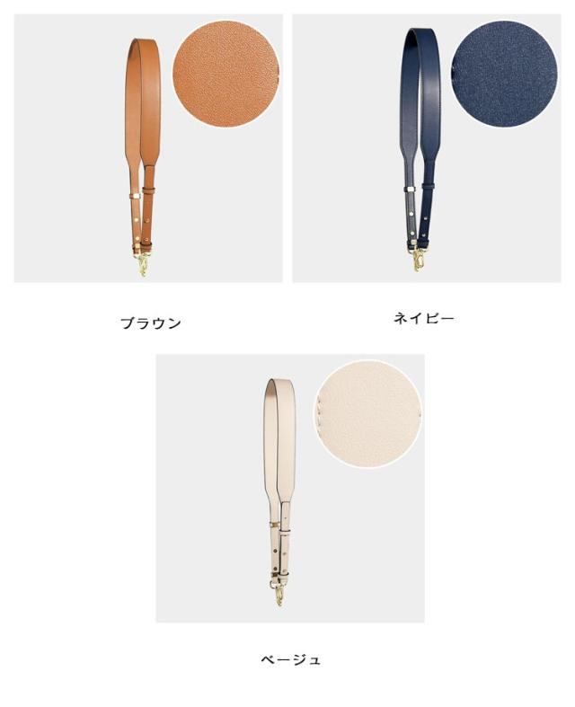 | ショルダーストラップ。 両端にある金属製のバックルは取り付けが簡単で、とても便利です。約102〜約113cmまで調節できるので、幅広いシーンでお使いいただけます◎ お手持ちのバッグのショルダー紐を付け替えるだけで、新品のような新鮮な気分でお使い頂けます。 | |
