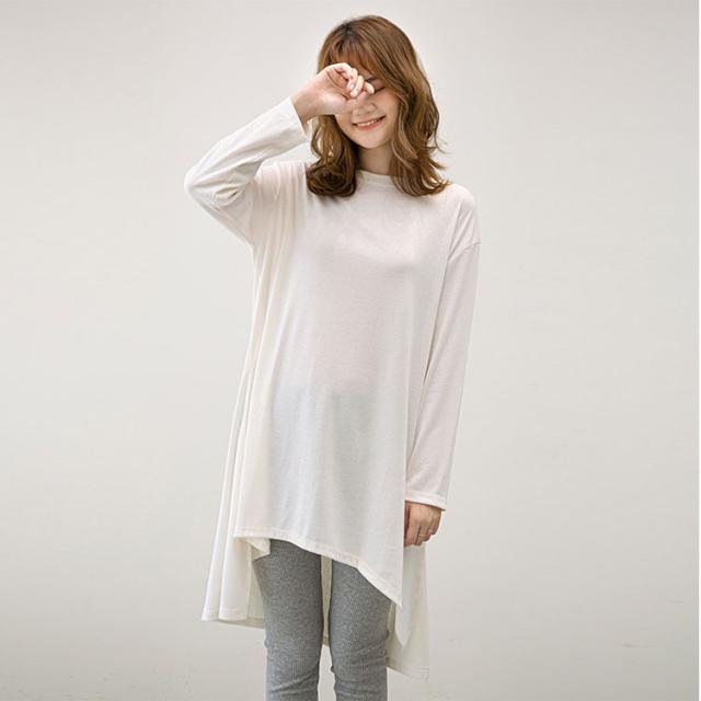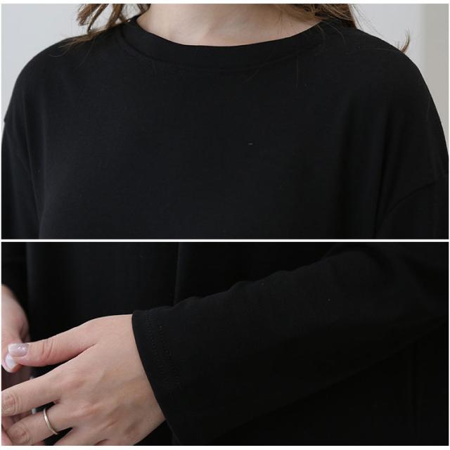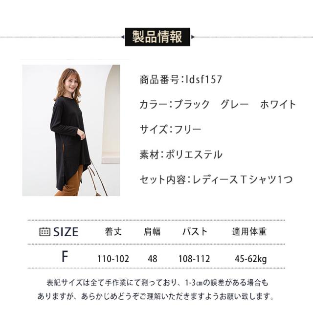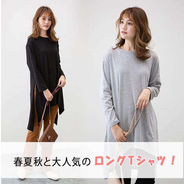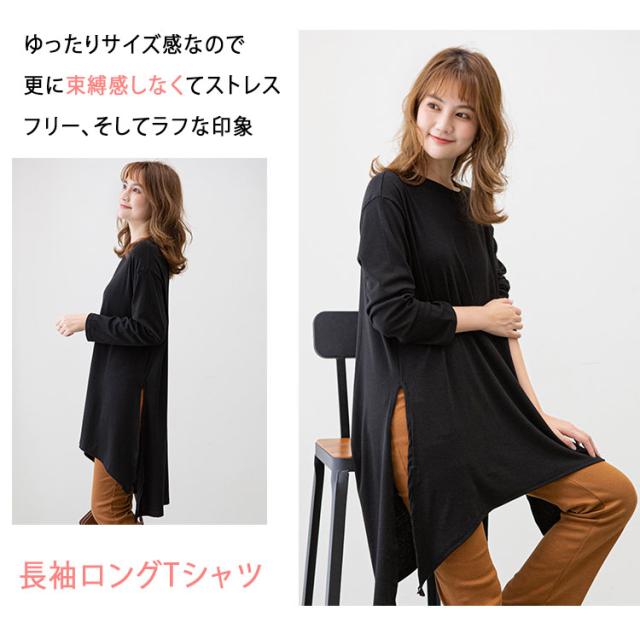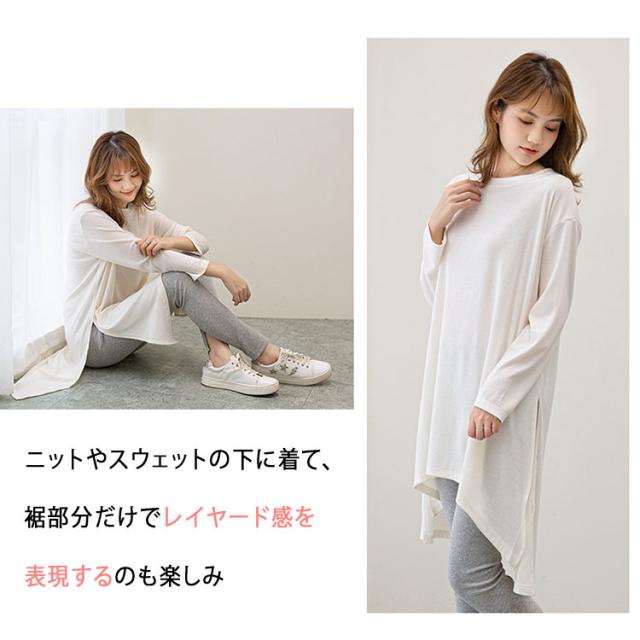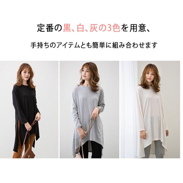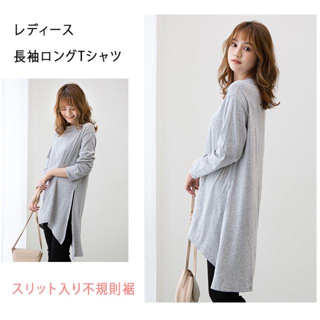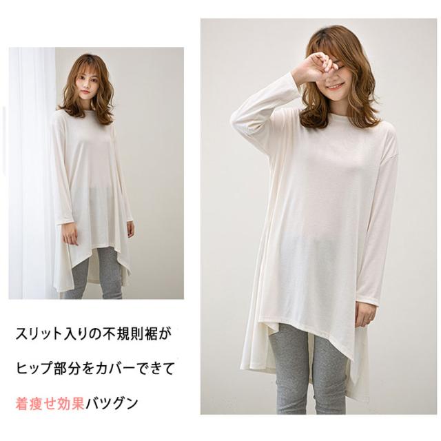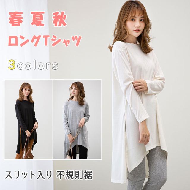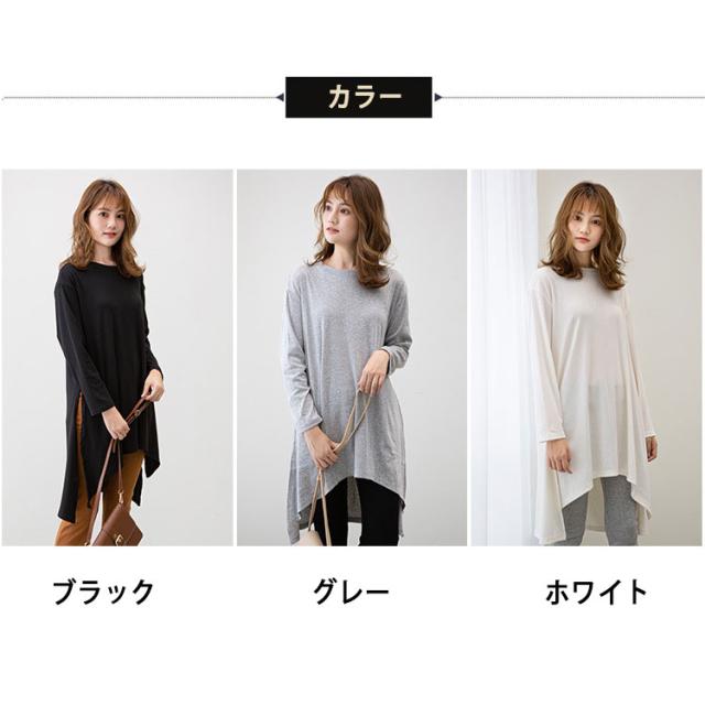 長袖 Tシャツ レディース ロング丈 チュニック ビッグシルエット Tシャツワンピ スリット入り 不規則裾 体型カバー ゆったり シンプル 無地 カジュアル きれいめ モード系 おしゃれ かわいい 重ね着 コーデしやすい 春 秋 冬 大きいサイズ