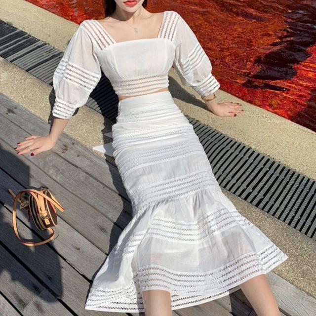 大人女性の清楚感を出してくれるショート丈トップスとハイウエストロングスカートの2点セット