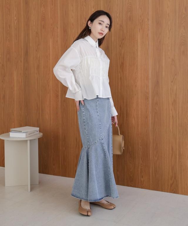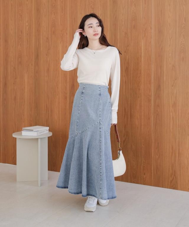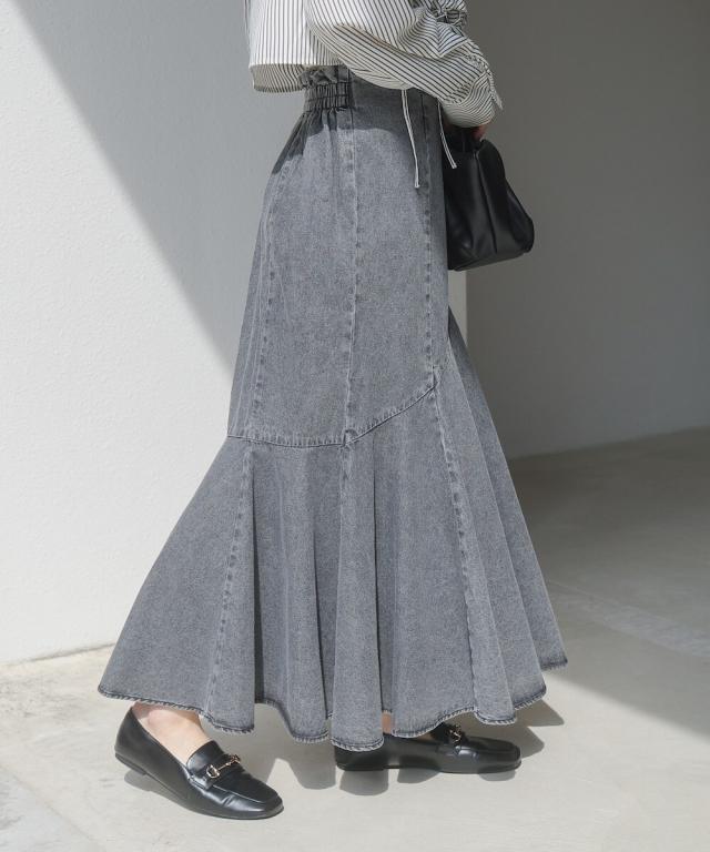 トレンドのマーメイドスカートに、デニムが登場。トレンドのマーメイドデザインが、華やかで女性らしいラインを引き立ててくれます。タイトシルエットでスタイルアップも叶えながら、ウエスト後ろはゴム仕様になっており程よいフィット感でリラックスした着心地です。