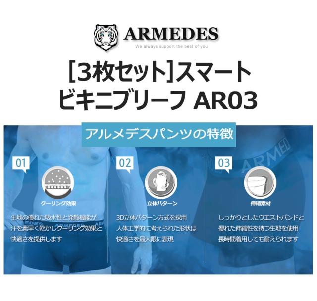 3枚セット ARMEDES アルメデス アンダーウェア ビキニブリーフ カール防止 吸汗速乾 速乾性抜群 ドライ素材 メンズ 全8色 S-3XL AR03