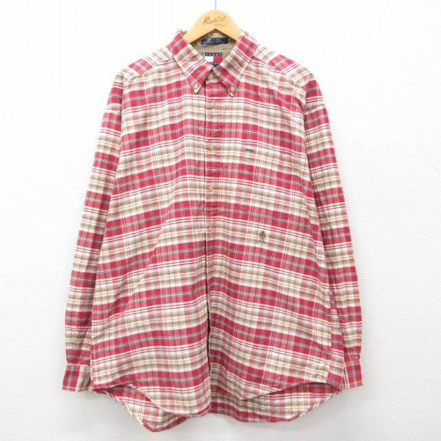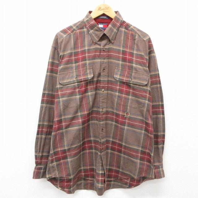 【商品名】 XL★古着 トミーヒルフィガー 長袖 ブランド シャツ メンズ 90年代 90s ワンポイントロゴ 大きいサイズ ロング丈 コットン ボタンダウン 緑他 チェック【spe】