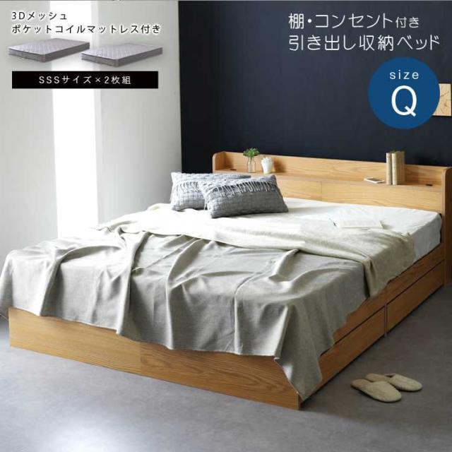 8色から選べる 棚・コンセント付き収納ベッド グレーマットレスセット クィーンサイズ RUES【ルース】