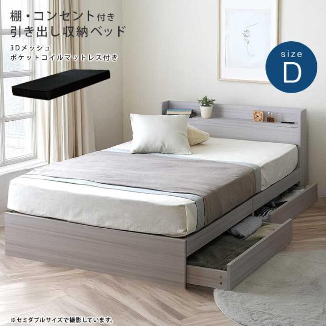 8色から選べる 棚・コンセント付き収納ベッド ブラックマットレスセット ダブルサイズ RUES【ルース】