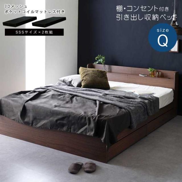8色から選べる 棚・コンセント付き収納ベッド ブラックマットレスセット クィーンサイズ RUES【ルース】