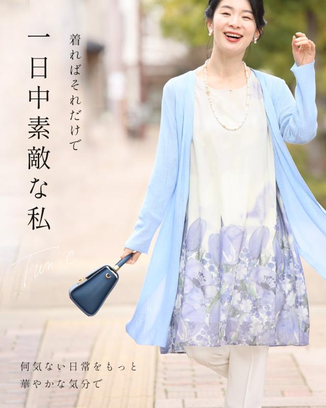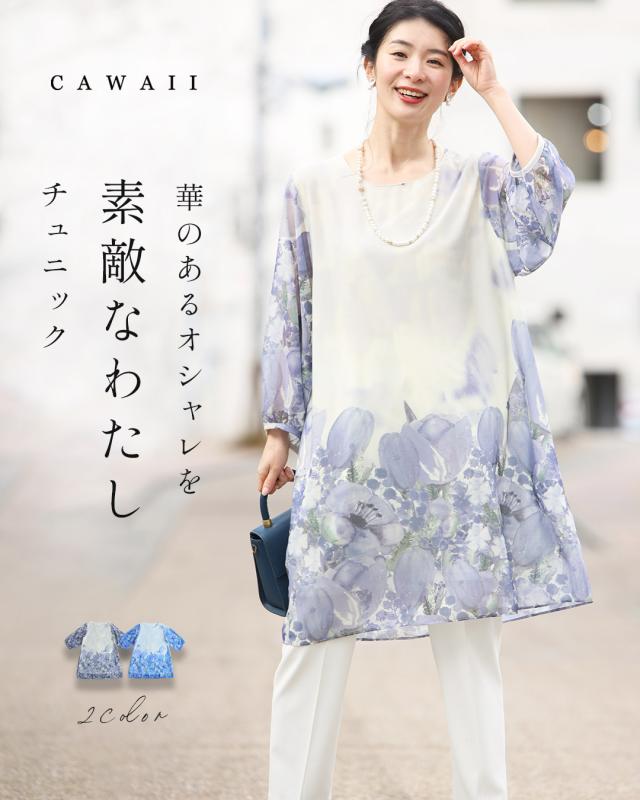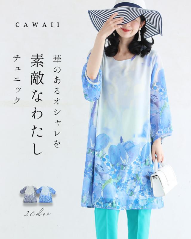 再入荷4月4日 華のあるオシャレを 素敵なわたし チュニック cawaii wkj00230 S~2L対応 トップス 春 夏 プリント 滲み花 日常使い おでかけ 旅行 女子会 体型カバー 着回し 重ね着 レイヤード ブルー グレー レディース ファッション 大人 ママ ミセス 30代 40代 50代