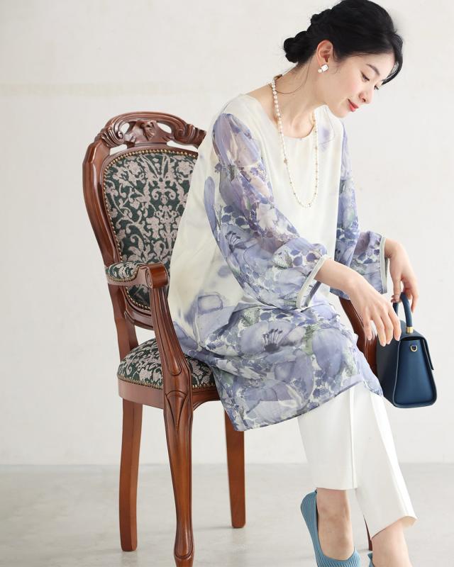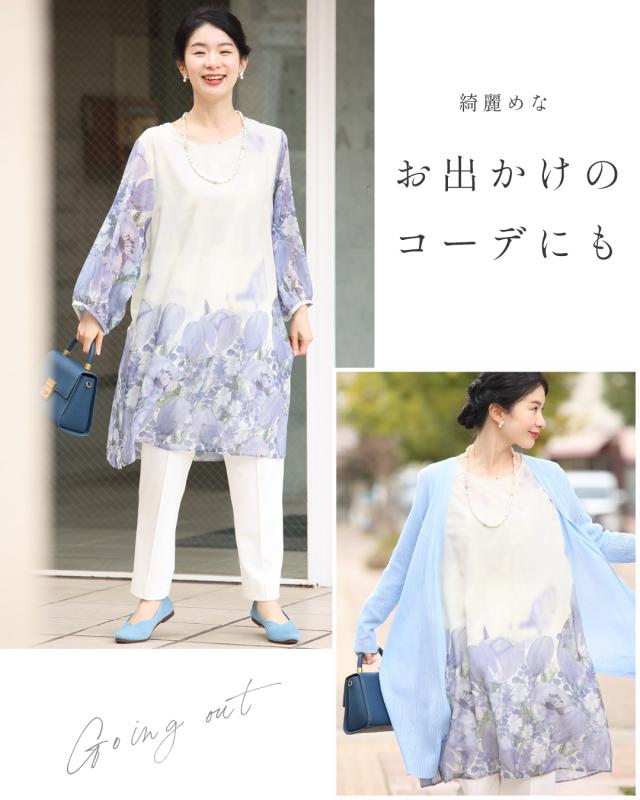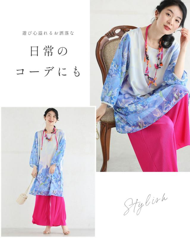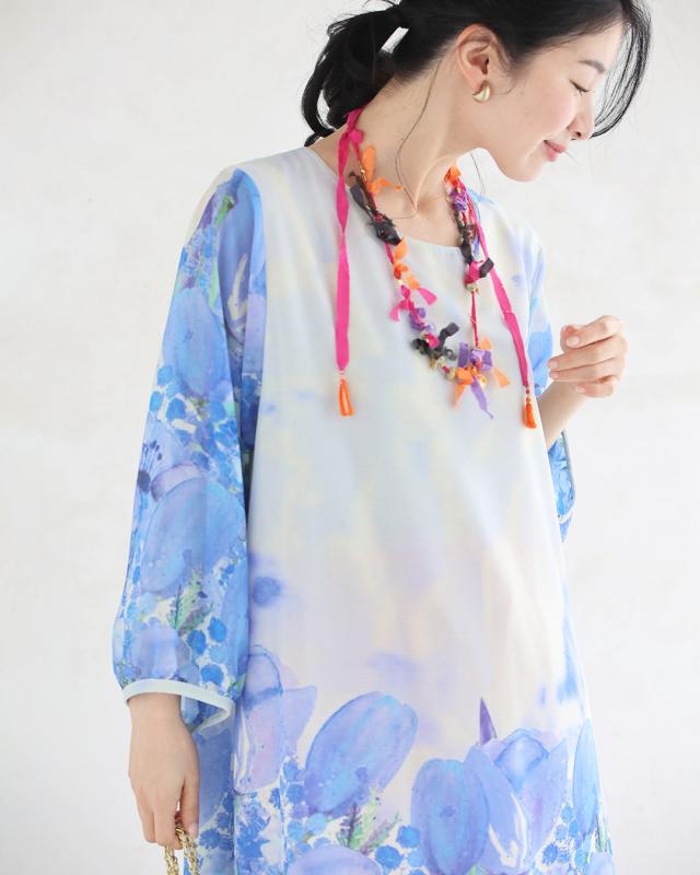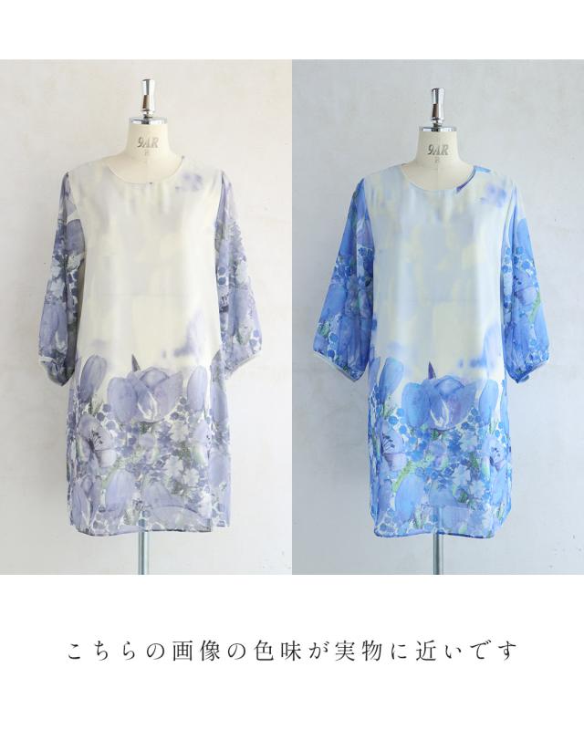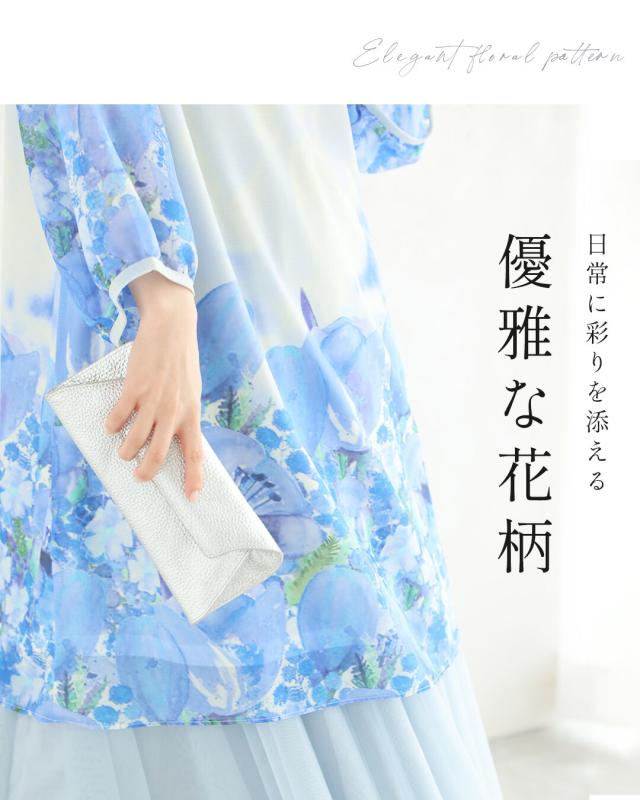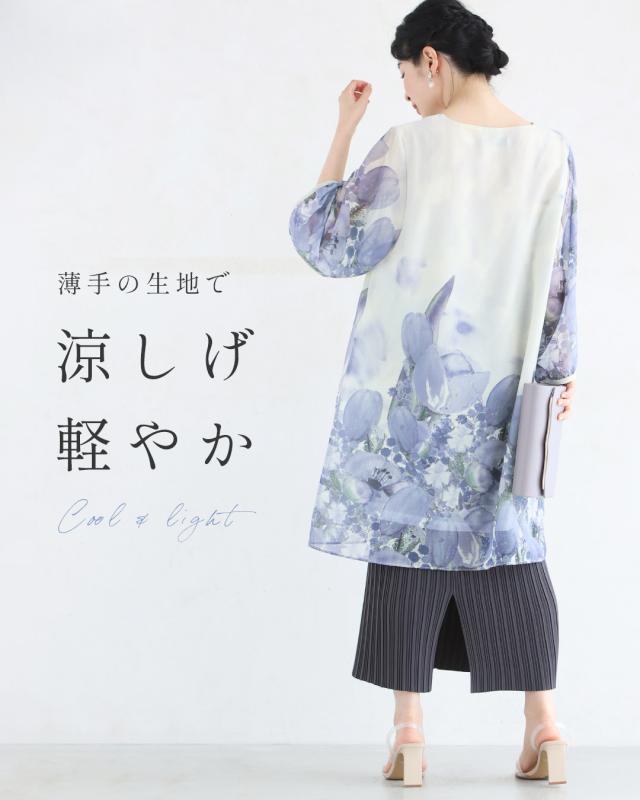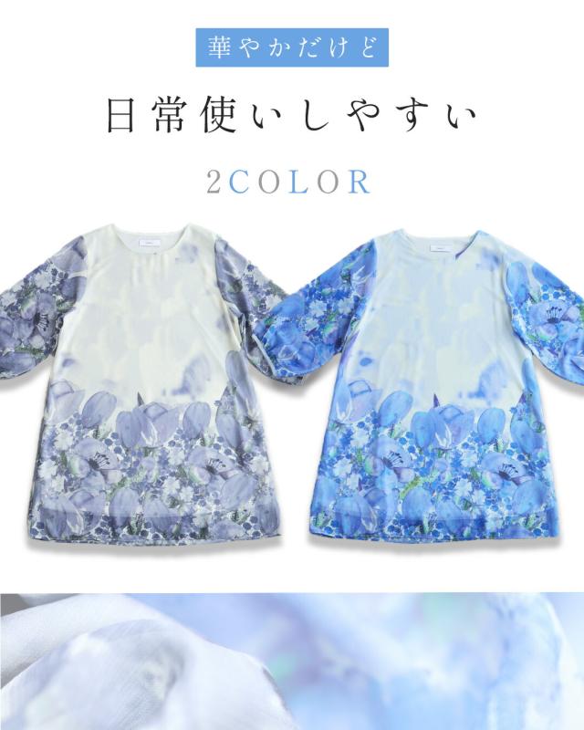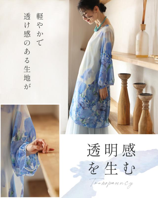wkj00230 新作 新着 再入荷 CAWAII FRENCHPAVE フレンチパヴェ エレガント ベーシック カジュアル 可愛い かわいい カワイイ おしゃれ オシャレ お洒落 個性 個性的 定番 ベーシック 大人かわいい 大人可愛い 上品 女性らしい デザイン スタンダード ナチュラル きれいめ キレイめ シンプル フェミニン レディース レディースファッション 大人 ママ ミセス 30代 40代 50代 60代 華のあるオシャレを 素敵なわたし チュニック トップス プルオーバー 半端袖 八分袖 九分袖 裏地付 ワンサイズ S M L 2L フリーサイズ フリー 小さめ 小さいサイズ 低身長 痩せ ほっそり 小柄 細身 標準サイズ F サイズ自由 ゆったり 薄手 涼感性 涼しい ずずしい 春 夏 秋 春服 春物 夏 夏服 夏物 軽やか 春コーデ 夏コーデ 体型カバー 着回し 重ね着 レイヤード 洗濯 手洗いOK ブルー 青 グレー 灰 柄 花 フラワー柄 ガーデン プリント 滲み花 普段着 日常使い おでかけ 旅行 女子会