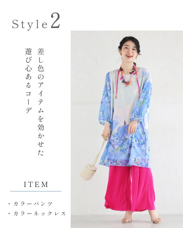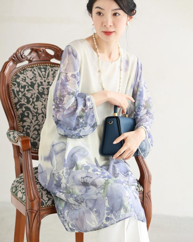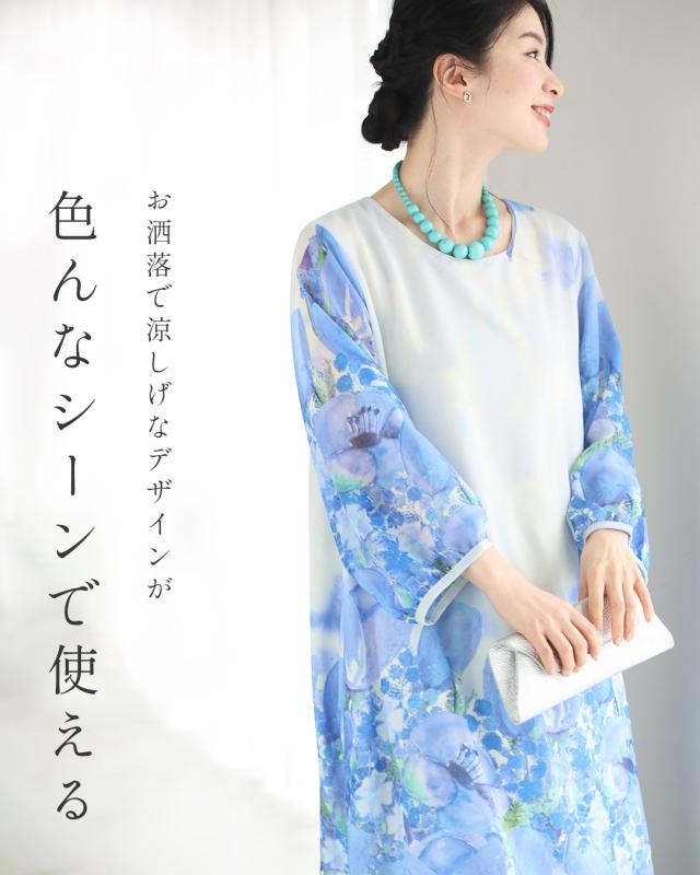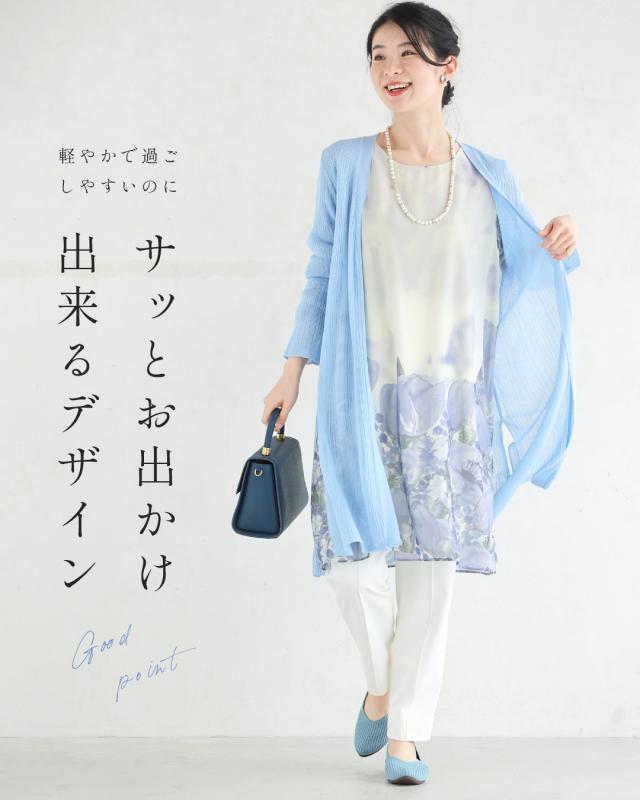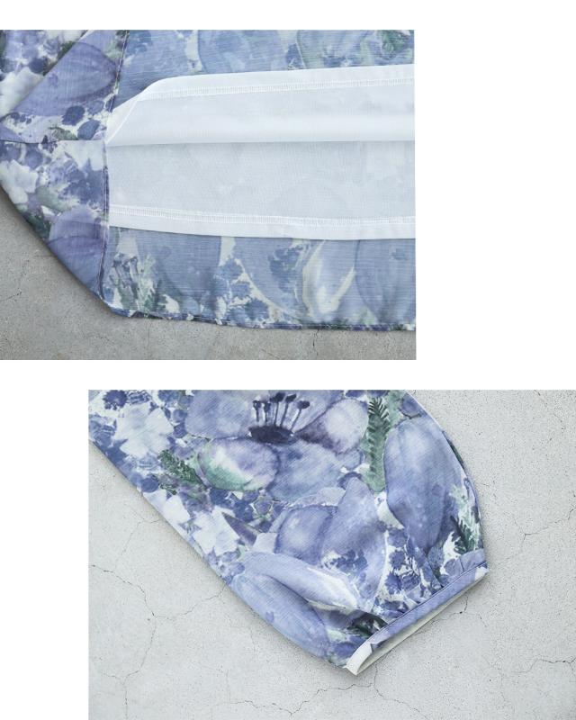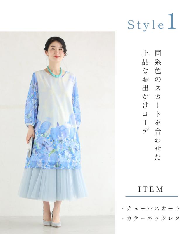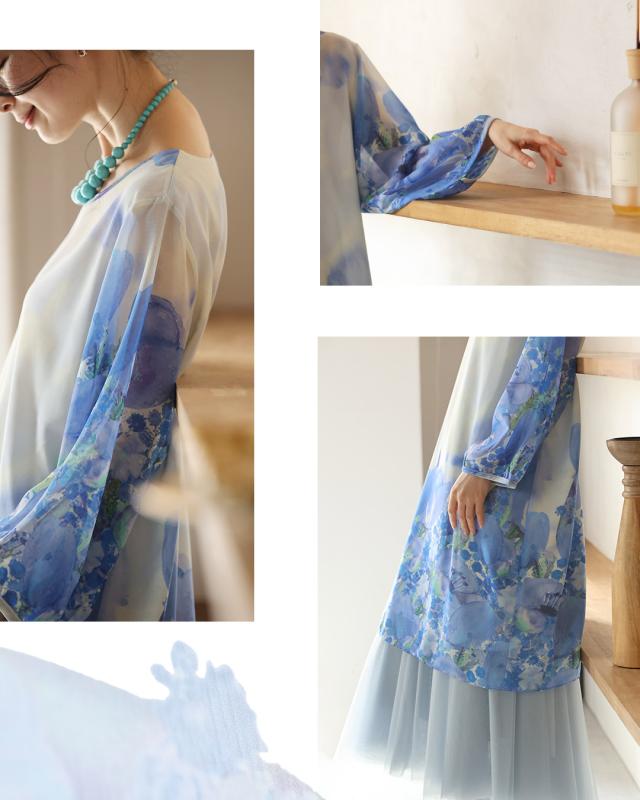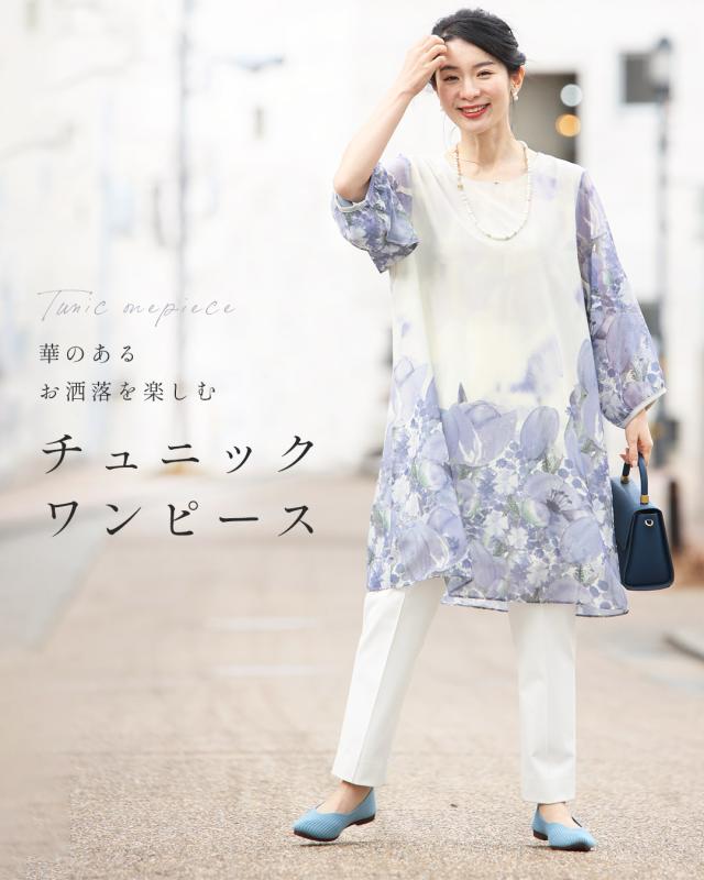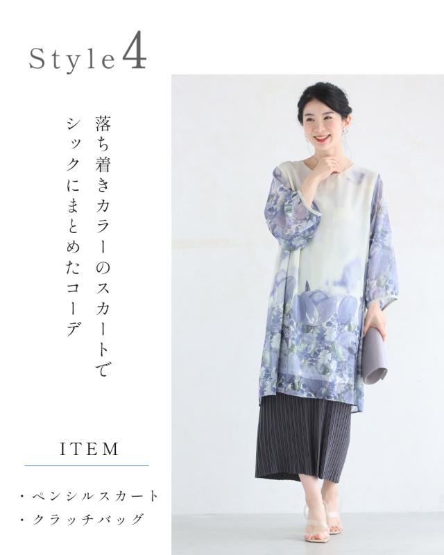 wkj00230 新作 新着 再入荷 CAWAII FRENCHPAVE フレンチパヴェ エレガント ベーシック カジュアル 可愛い かわいい カワイイ おしゃれ オシャレ お洒落 個性 個性的 定番 ベーシック 大人かわいい 大人可愛い 上品 女性らしい デザイン スタンダード ナチュラル きれいめ キレイめ シンプル フェミニン レディース レディースファッション 大人 ママ ミセス 30代 40代 50代 60代 華のあるオシャレを 素敵なわたし チュニック トップス プルオーバー 半端袖 八分袖 九分袖 裏地付 ワンサイズ S M L 2L フリーサイズ フリー 小さめ 小さいサイズ 低身長 痩せ ほっそり 小柄 細身 標準サイズ F サイズ自由 ゆったり 薄手 涼感性 涼しい ずずしい 春 夏 秋 春服 春物 夏 夏服 夏物 軽やか 春コーデ 夏コーデ 体型カバー 着回し 重ね着 レイヤード 洗濯 手洗いOK ブルー 青 グレー 灰 柄 花 フラワー柄 ガーデン プリント 滲み花 普段着 日常使い おでかけ 旅行 女子会