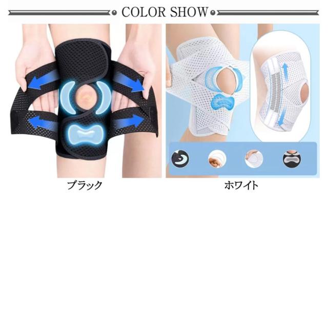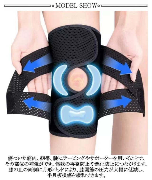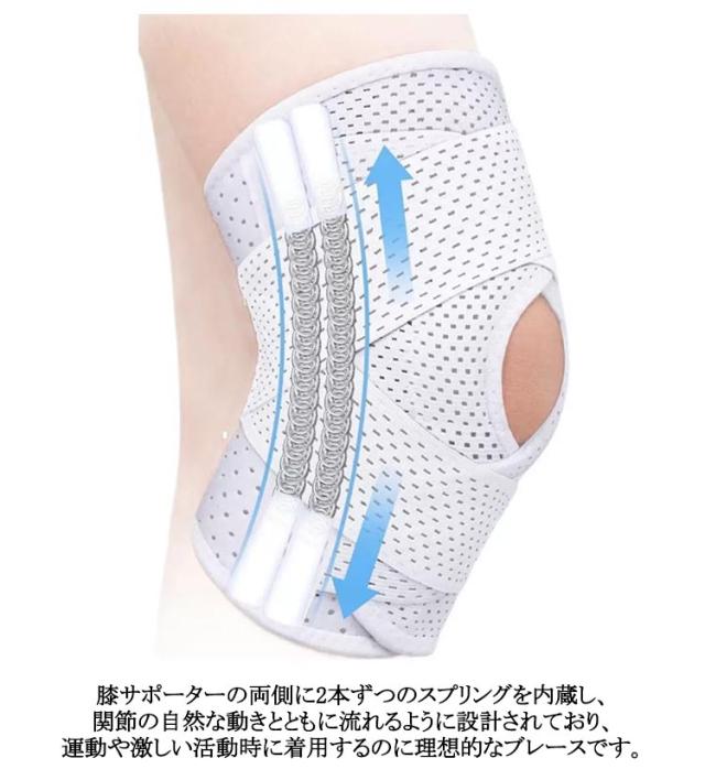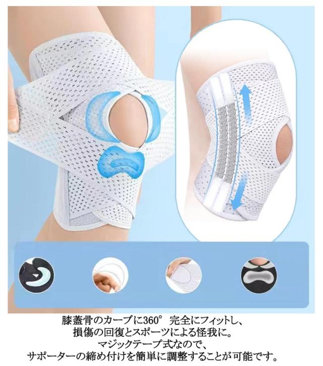 | 【効果的な保護をしてくれる膝用 サポーター】 関節や筋肉、靭帯、腱をがっちり補強】 傷ついた筋肉、靭帯、腱にテーピングやサポーターを用いることで、その部位の補強ができ、怪我の再発防止や悪化防止につながります。 膝の皿の両側に月形パッドにより、膝関節の圧力が大幅に低減し、半月板損傷を緩和できます。 膝に巻くV型マジックテープを2本追加し、膝の上下に交差して、膝蓋骨の安定に役立ちます。左右のぐらつきも防止しながら、今までにない最高のホールド感を体験できる膝サポーター。 膝サポーターの両側に2本ずつのスプリングを内蔵し、関節の自然な動きとともに流れるように設計されており、運動や激しい活動時に着用するのに理想的なブレースです。 曲げ伸ばしの多い膝頭や裏側は、食い込みを防いでカーブカット構造になっています。メッシュ生地採用ですので、ムレにくいのもポイントです。 膝蓋骨のカーブに360°完全にフィットし、損傷の回復とスポーツによる怪我に。 マジックテープ式なので、サポーターの締め付けを簡単に調整することが可能です。 このひざサポーターは通気性、吸汗速乾性に優れ、汗をかいてもサラッと快適です。 ボトムを履いたまま簡単に着け外しできるフルオープンタイプの膝サポーターです。 ランニング、ジョギング、ジム、ウェイトリフティング、バスケットボールなど、数多くのスポーツで幅広く使用されている膝用サポーターです。また、手術後の回復のために運動する方や、長時間立ったり歩いたりする方にもお勧めです。日常生活で使用すると、24時間一日中サポートが受けられます。 | |