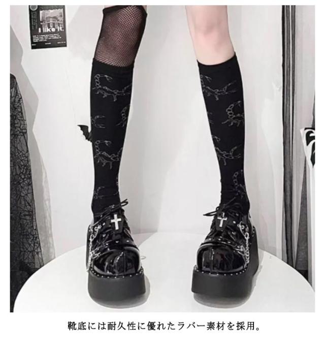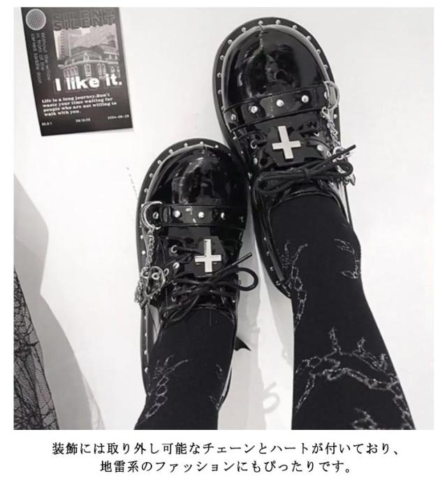 | 厚底ローファー。厚底デザインで、ヒールの高さは8cmです。 足元に安定感を持たせると同時に、美脚効果も発揮します。長時間の歩行でも疲れにくい快適な履き心地です。 装飾には取り外し可能なチェーンとハートが付いており、地雷系のファッションにもぴったりです。シーンに応じて簡単にカスタマイズでき、個性的なスタイルを楽しめます。 靴底には耐久性に優れたラバー素材を採用。滑りにくく、しっかりとしたグリップ力があり、安心して歩行できます。通勤やお茶会など、様々なシーンで活躍します。 | |