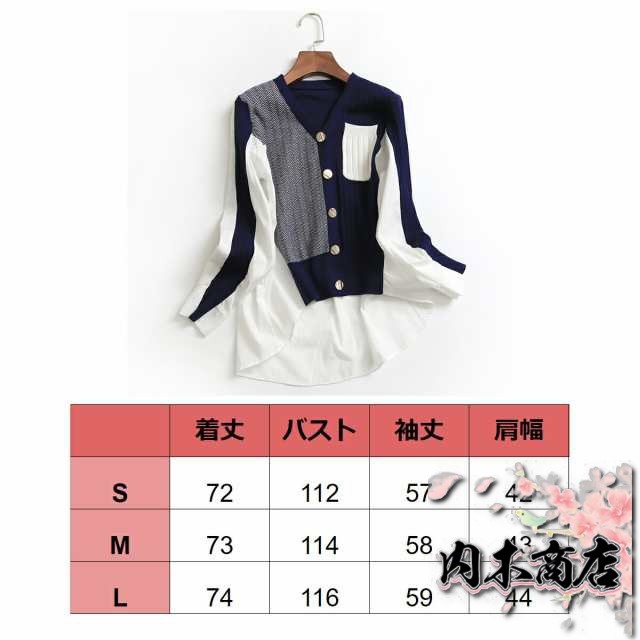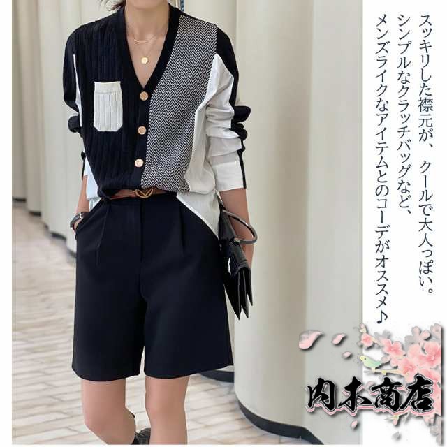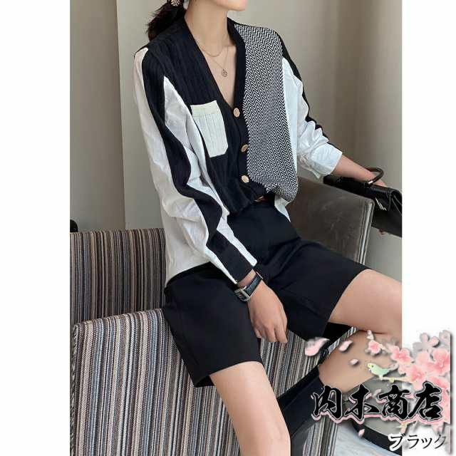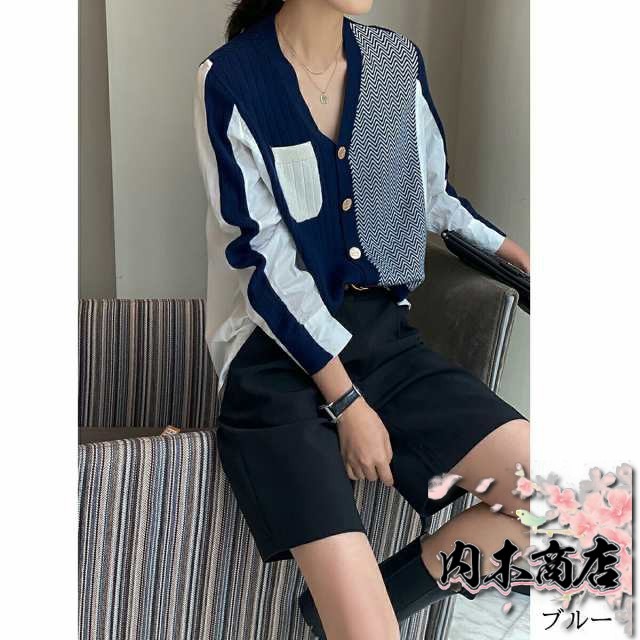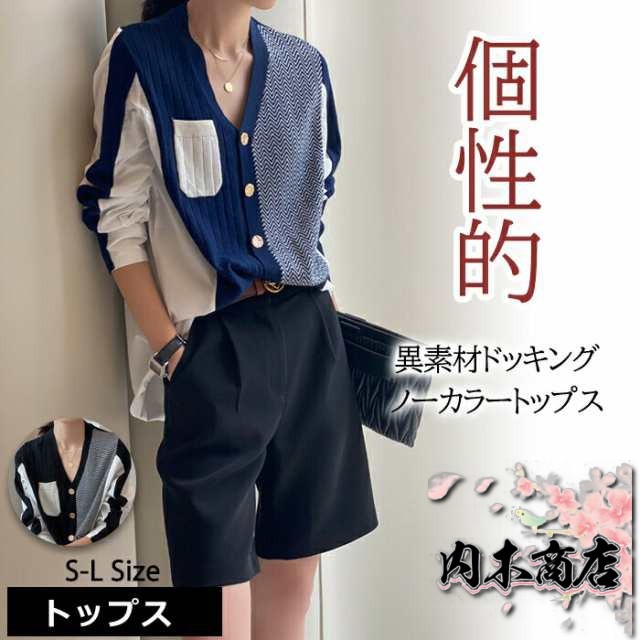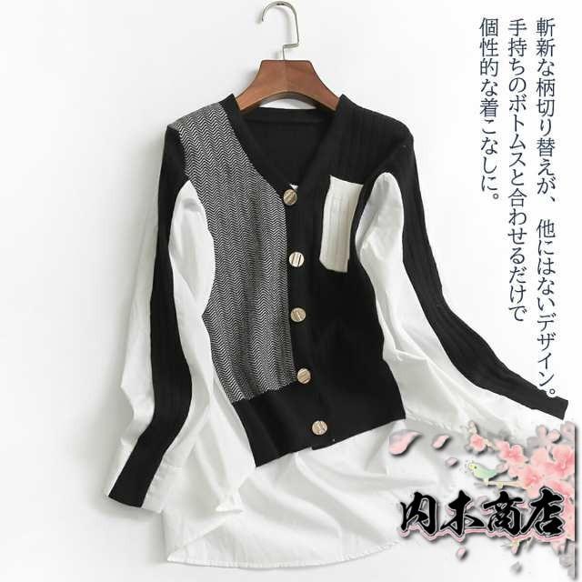 個性的 メンズライク ブラウス ニット シャツ カーディガン へリンボーン 異素材 ドッキング レディース トップス 通勤 通