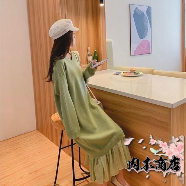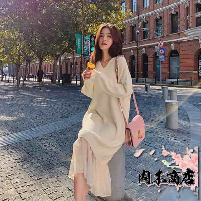 全4色 vネック ロング丈 ニットワンピース ニット ワンピース レディース 秋 冬 春 長袖 きれいめ 厚手 ゆったり 大きいサイズ 裾 切り替え プリーツ ロングワンピース 厚手 体型カバー 上品 ベージュ