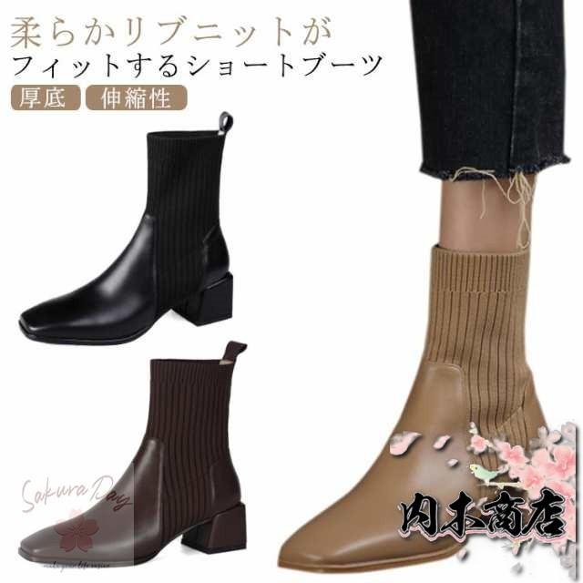 チャンキーヒール 楽ちん レディース サイドニット 秋冬 ソックスブーツ ショートブーツ オフィス 疲れにくい 22.5cm 通勤 5.3センチヒール 痛くない スクエアトゥ リブニット きれいめ おしゃれ ニットソックスブーツ 履きやすい