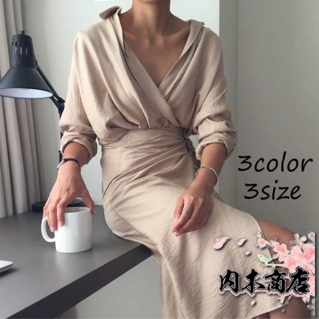 カシュクールワンピース タイトワンピ ラップワンピ シャツワンピ 無地 Vネック 長袖 膝丈 オフィス きれいめ ウエストリボン