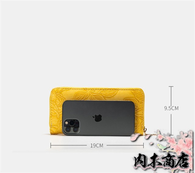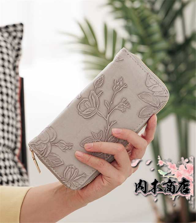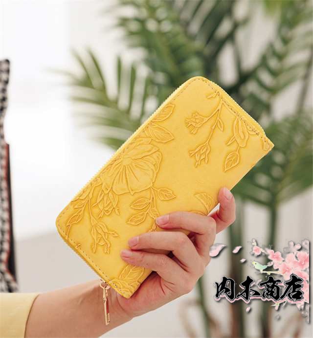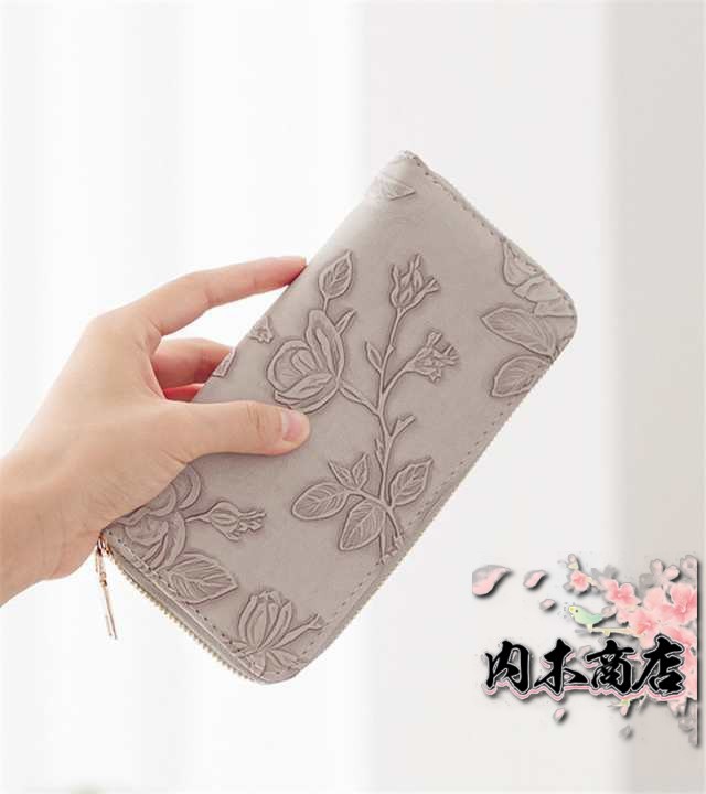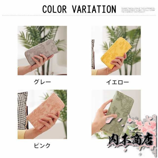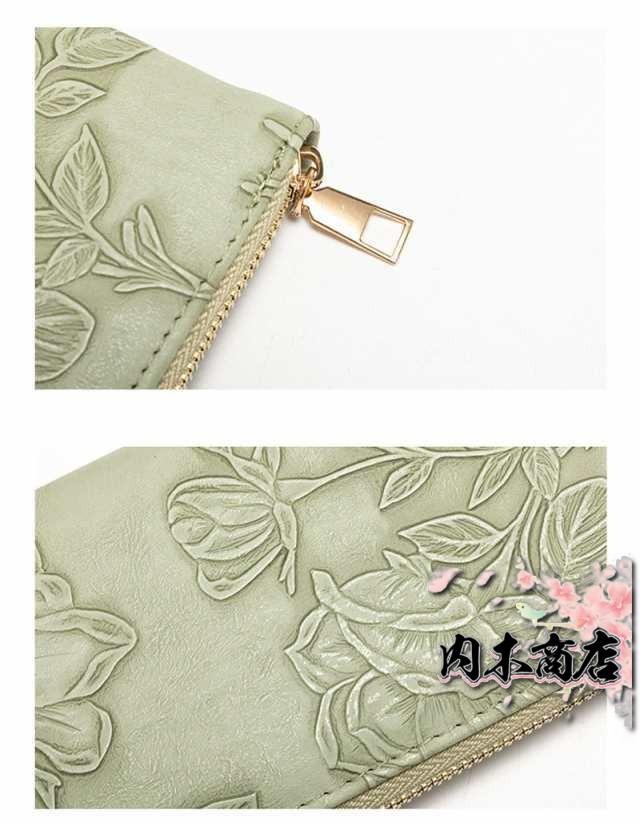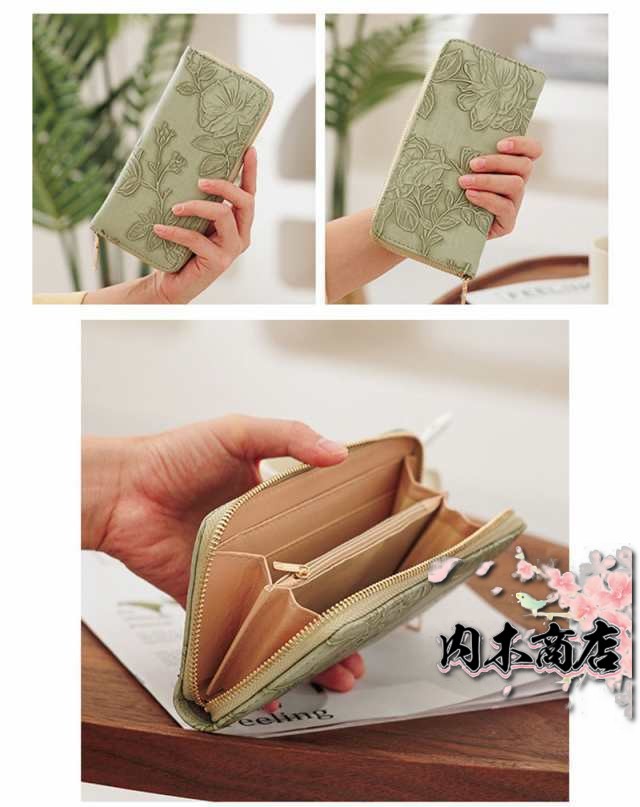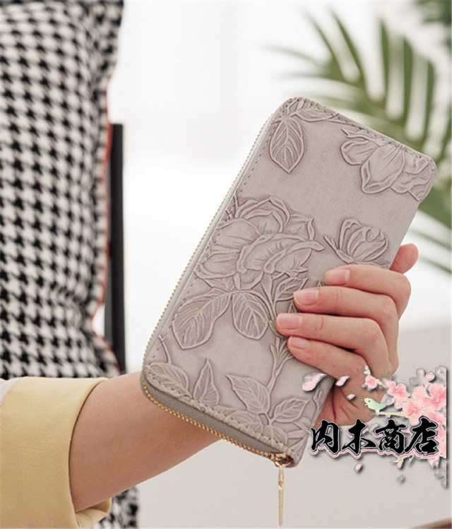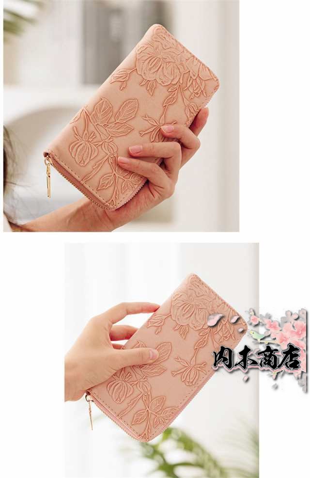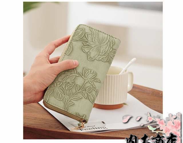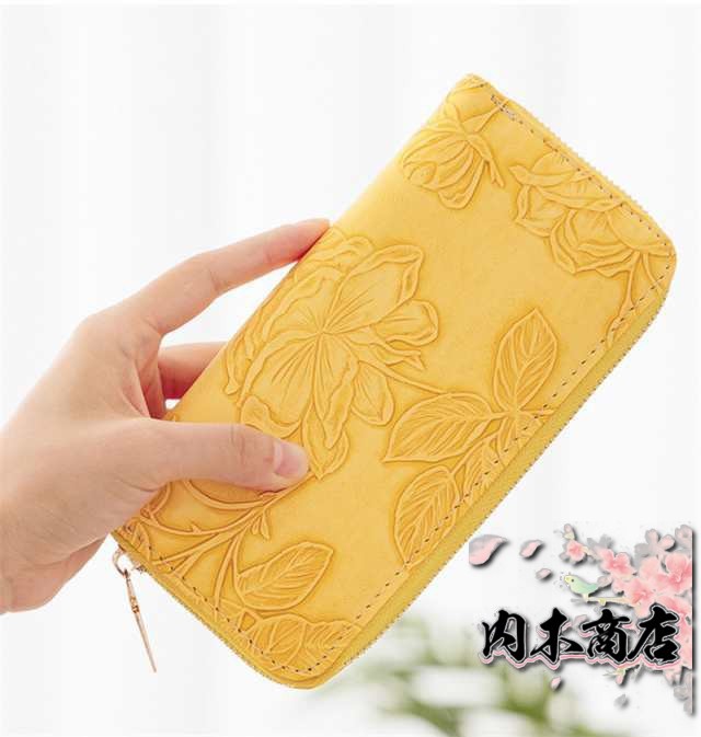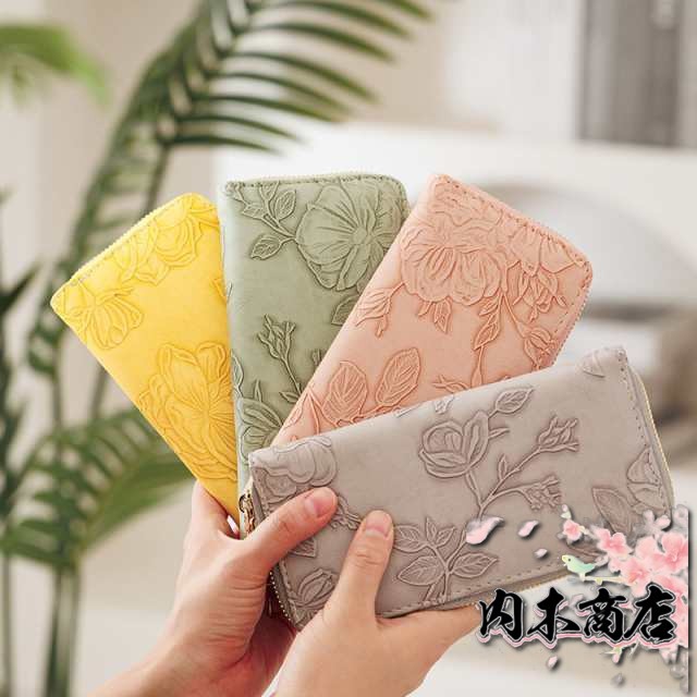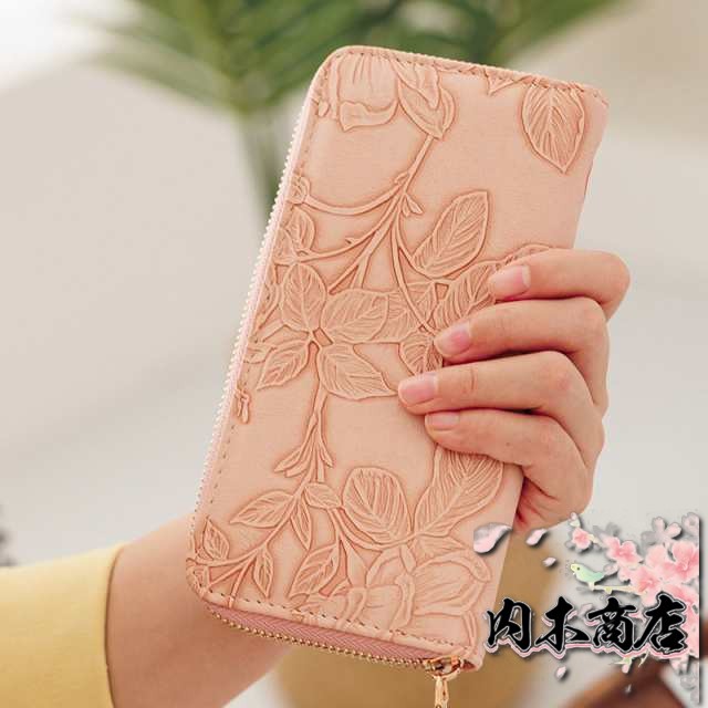 ◎花型押し仕上げが上品で女性らしいデザインの革長財布。