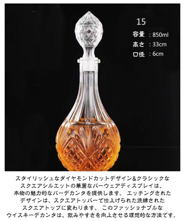 | 鉛フリー 大容量 ウイスキーデカンター 20タイプ ●スタイリッシュなダイヤモンドカットデザイン&クラシックなスクエアシルエットの華麗なバーウェアディスプレイは、本物の魅力的なバーデカンタを提供します。 エッチングされたデザインは、スクエアトッパーで仕上げられた洗練されたスクエアトップに変わります。 このファッショナブルなウイスキーデカンタは、飲みやすさを向上させる理想的な方法です。 ●大容量&スタイリッシュでエレガントな外観で、現代的なデザインでテーブルの美観を高めます。厚くて重いガラス製で、複雑な彫刻が施されたこの素敵なデカンターは、光の中で輝き、日差しを広げます。 ディスプレイに完全に安全に使用でき、高品質のガラスデカンターで座ってリラックスしてお気に入りの飲み物を楽しむことができます。 ●完璧なギフト - 思慮深くエレガントなギフトをお探しなら、もう探す必要はありません。 誕生日、休日、結婚式、卒業式など、どんな場面でも - これらの美しく作られたウイスキーデカンタは理想的です! 記念日、新築祝い、クリスマスプレゼント、クリスマスプレゼント、キッチンギフト、結婚式や婚約ギフト、独身/独身パーティーなどに最適です。 | |