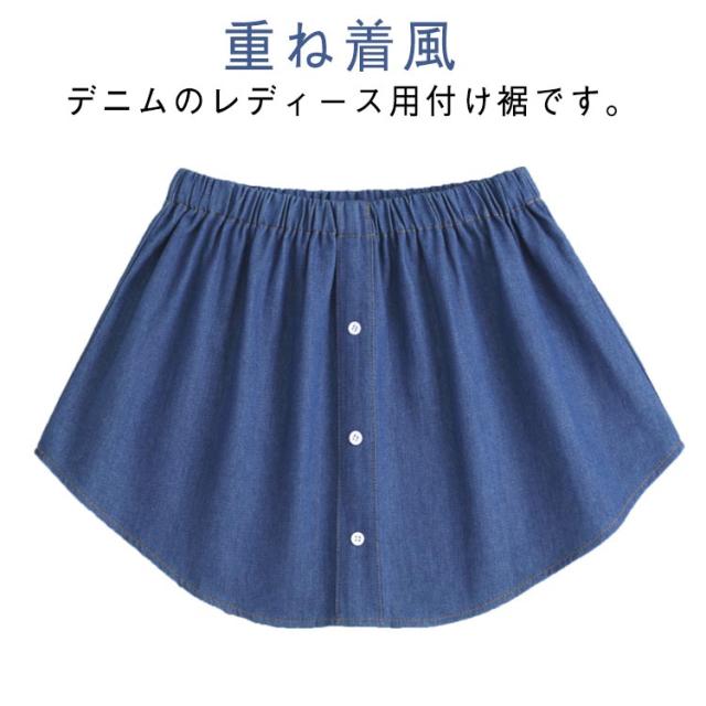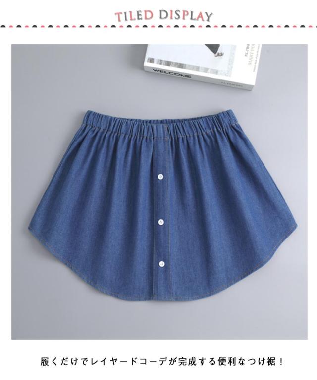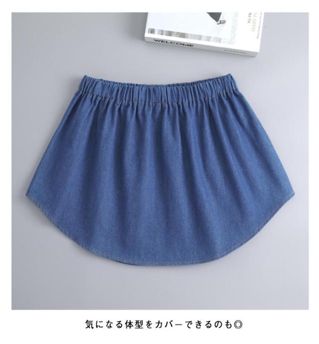 | デニムのレディース用付け裾です。 履くだけでレイヤードコーデが完成する便利なつけ裾! 穿くだけで気軽にレイヤード風スタイルが楽しめます♪ ウエストはゴムなので、トップスに合わせた丈感に調整可能。 気になる体型をカバーできるのも◎ | |
