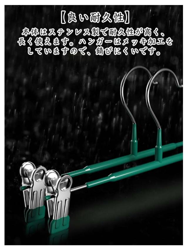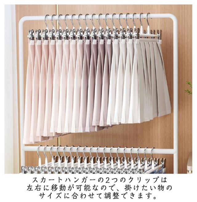 | 【滑り止め設計】繊細なシルクからデニムまで、調節可能なステンレス製のクリップで服をしっかりホールドし、シワを防ぎます。 ピンチ先端には生地に優しいすべり止めが付いており、衣類を優しく挟んでくれて、滑り落ちなど心配がありません。 ズボン、スカート、マフラーなどに適用するだけでなく、水着とタオルや雑巾でも大活躍です。 【良い耐久性】本体はステンレス製で耐久性が高く、長く使えます。ハンガーはメッキ加工をしていますので、錆びにくいです。 厳選された素材、より強い耐荷重性、重い服でも使用可能です。 【水濡れOK】PVCは工業製品で良く使われてるプラスチックの一種でビニールハウス等にも使われています。 このことから、耐水性と耐候性に優れていることがわかります。 【様々な場で活用】スカートハンガーの2つのクリップは左右に移動が可能なので、掛けたい物のサイズに合わせて調整できます。 調整可能な多機能ハンガーは男性や女性、老人や子供の衣類に全部対応でき、家族多い家庭にとって不可欠なハンガーです。 | |