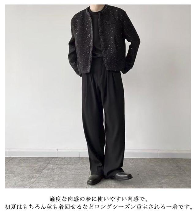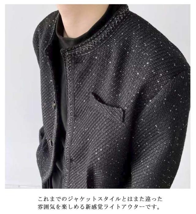 メンズ 春アウター 韓国系 スプリングコート ツイードジャケット カジュアル ショート丈 秋 ノーカラー ジャケット オフィス ノーカラージャケット 通勤 春 ツイード風 大人 きれいめ 2025 韓国 黒 ブラック 大きいサイズ カジュアルジャケット おしゃれ